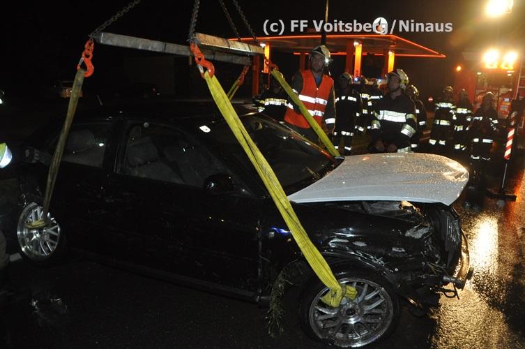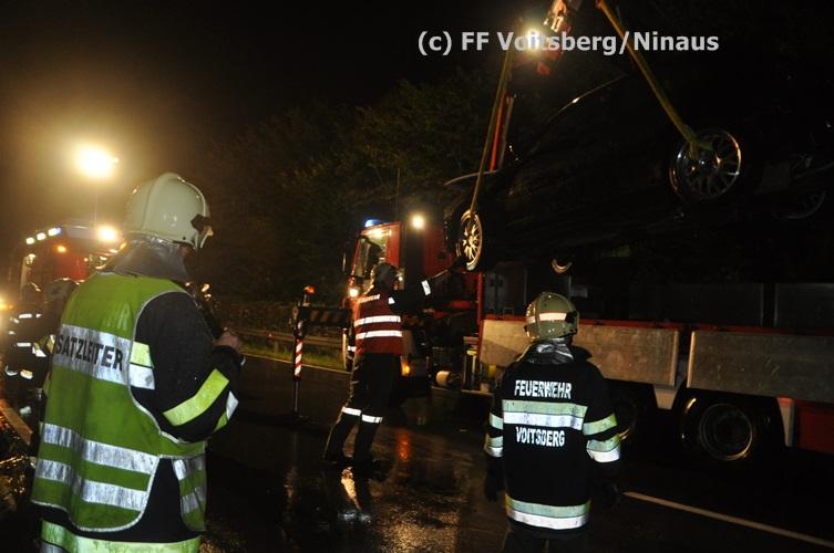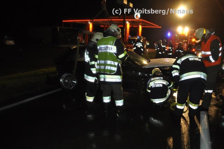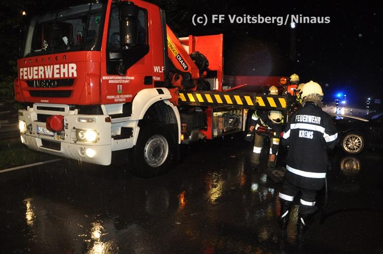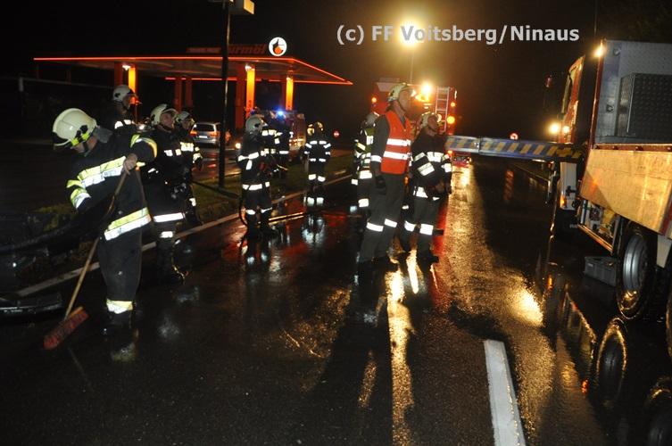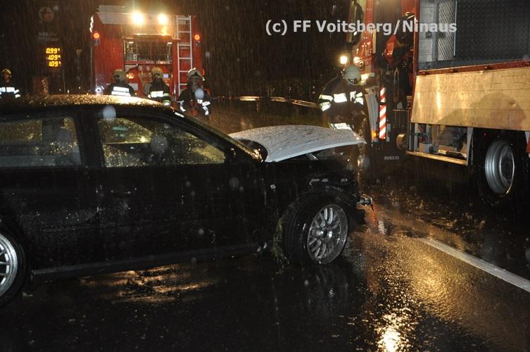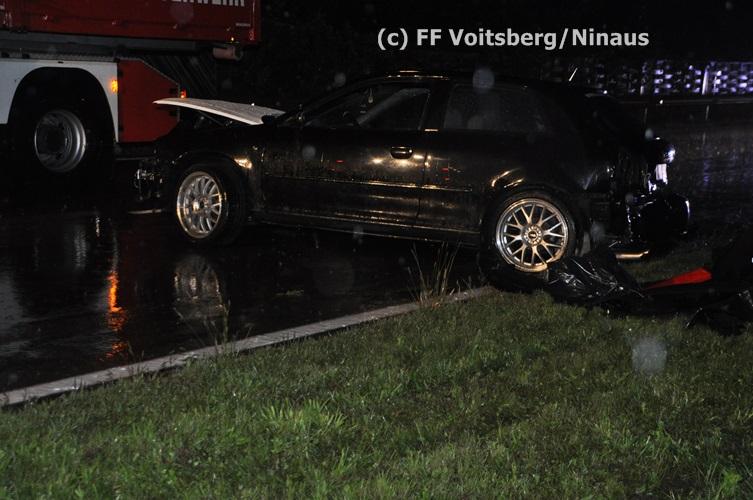 VOITSBERG, am 02.09.2015 Ein PKW kam auf der Umfahrungsstraße Voitsberg der B 70 auf Höhe Tankstelle in Krems ins Schleudern, stieß gegen eine Leitschiene und eine Bordsteinkante und kam mitten der Fahrbahn auf den Rädern zu stehen. Glücklicherweise kam kein Fahrzeug entgegen. ansonsten wäre ein Frontalzusammenstoß wohl unvermeidlich gewesen. Die alarmierte FF Krems sicherte die Unfallstelle ab, entfernte herumliegende Wrackteile und regelte den Verkehr. Das WLF-Kran der Stadtfeuerwehr Voitsberg barg das schwer beschädigte Fahrzeug und brachte es von der Unfallstelle. Die polizeilichen Erhebungen führte die Polizei Voitsberg durch. Nach ersten Angaben wurde niemand verletzt. Eingesetzt waren die FF Krems mit TLFA und KLF und 15 Mann und die FF Voitsberg mit WLF-Kran und KRFB mit 6 Mann sowie eine Polizeistreife mit 2 Beamten. Einsatzleiter: HBI Günter Poschner, FF Krems