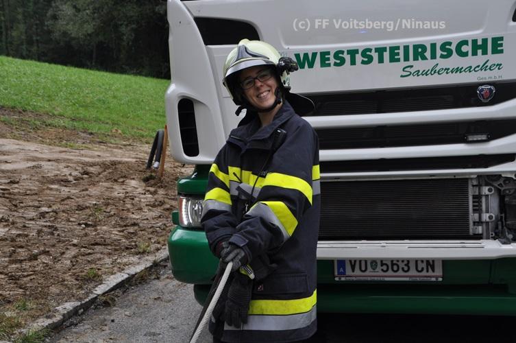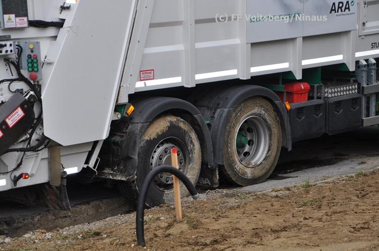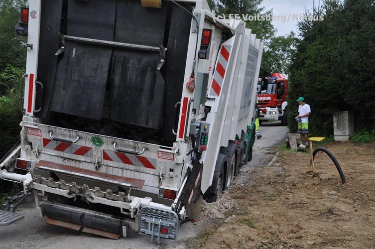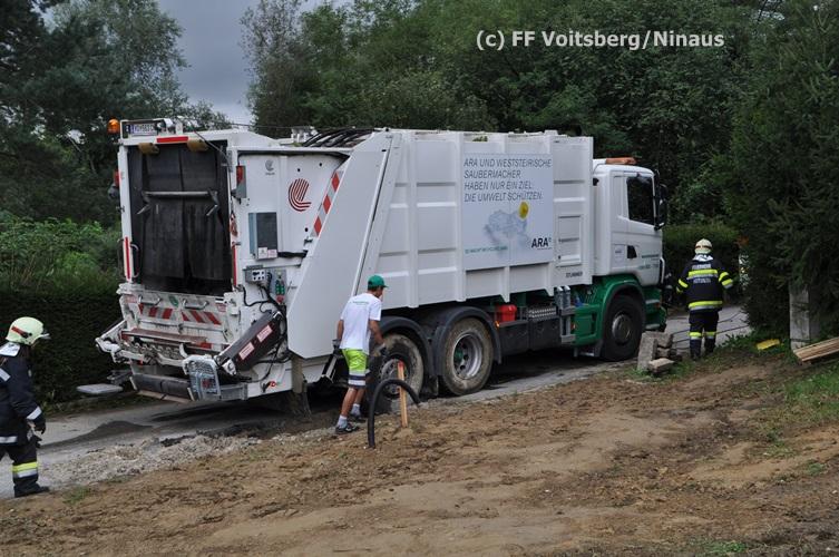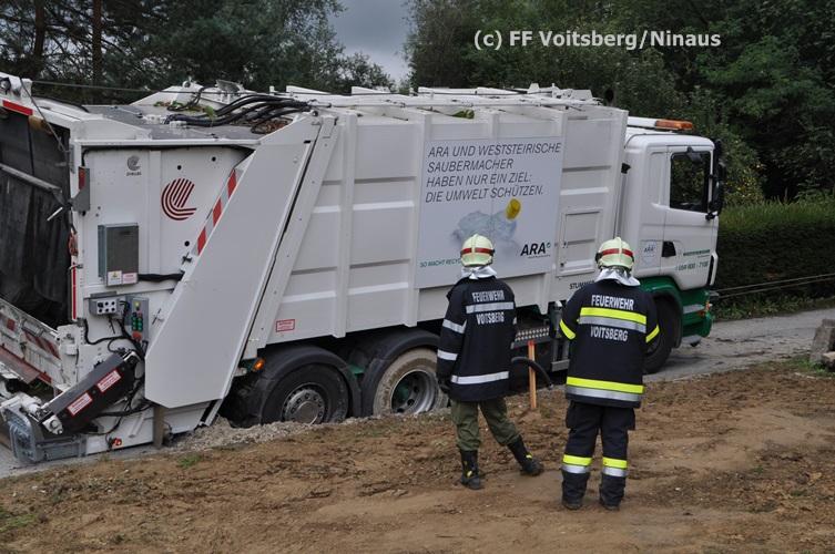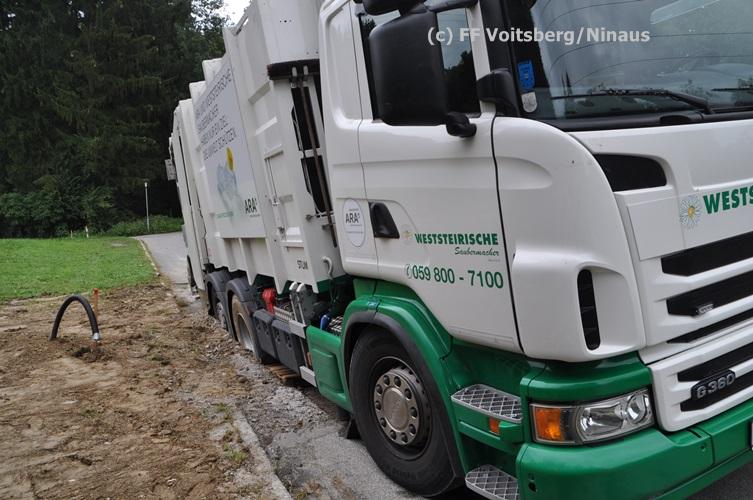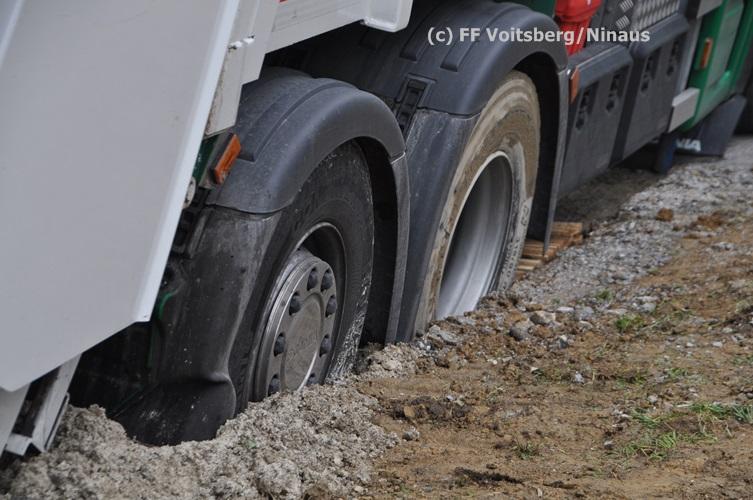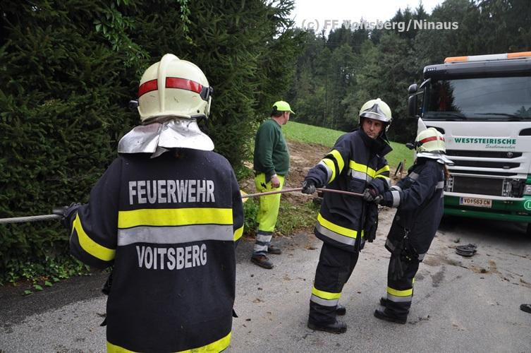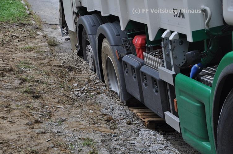 VOITSBERG, am 03.09.2015 Ein LKW geriet mit den zwei rechten hinteren Rädern in eine Künette und konnte blieb im Erdreich stecken. Die Bergung erfolgte mit der Seilwinde des WLF-Kran. Der LKW konnte die Fahrt auf eigener Achse wieder fortsetzen. Im Einsatz standen das WLF-Kran und das KRFB mit 6 Mann.