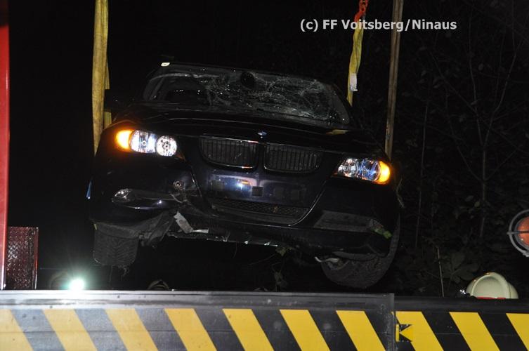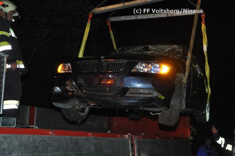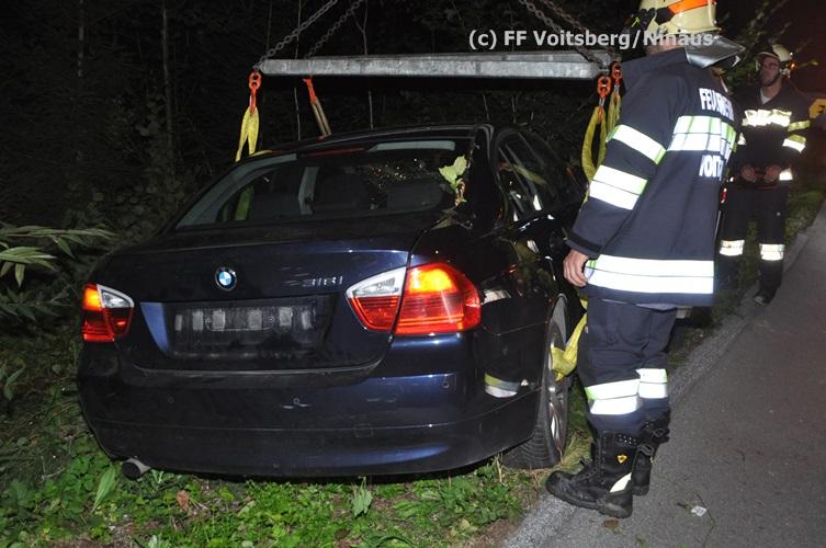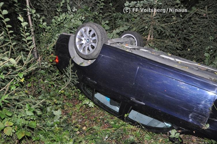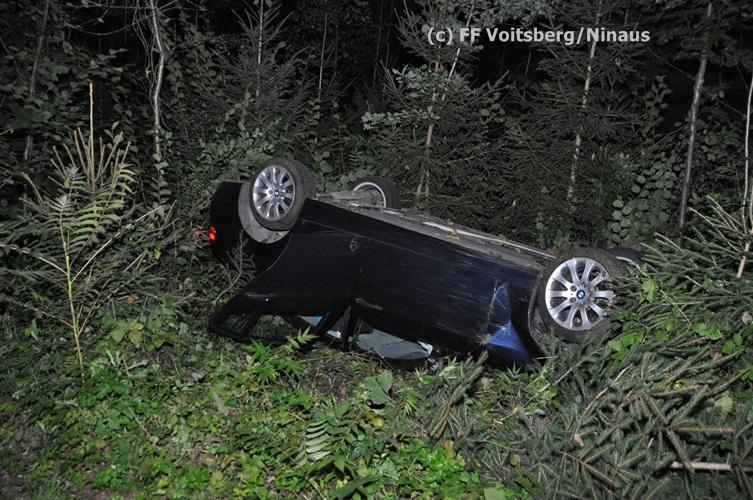 VOITSBERG, am 09.09.2015 Ein PKW kam aus unbekannter Ursache auf einer Gemeindestrasse bergwärts fahrend von der Straße ab, überschlug sich und kam mit den Rädern nach oben zu liegen. Der Fahrzeuglenker konnte sich aus dem beschädigten Fahrzeug unverletzt befreien. Die Bergung erfolgte mit dem WLF-Kran.