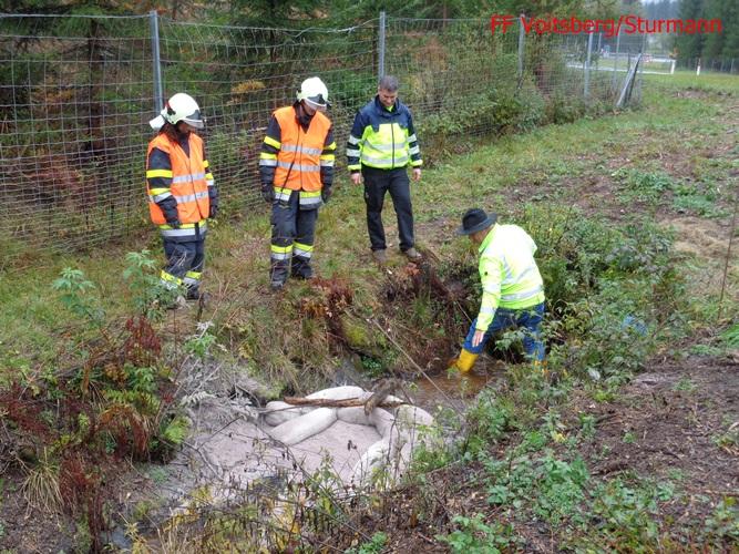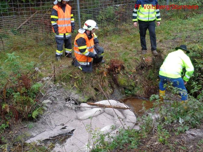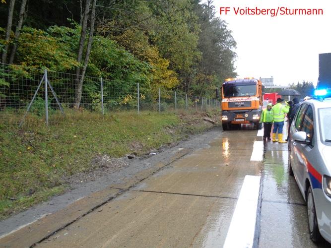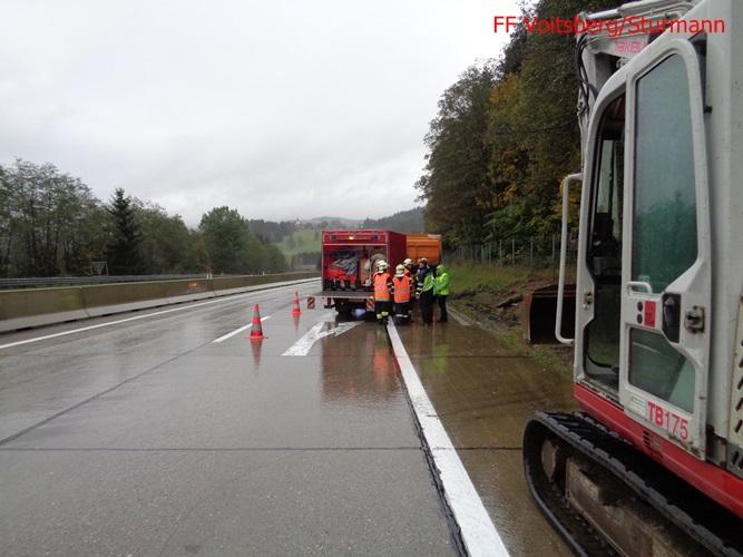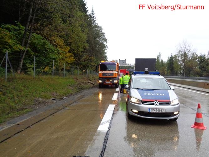 VOITSBERG, am 11.10.2015 Am Vortag ereignete sich auf der A 2 zwischen Mitterbergtunnel und Abfahrt Modriach ein Verkehrsunfall mit einem LKW, welcher umstürzte. Einsatz von ÖF Voitsberg wurde am 11.10. angeordnet. Errichten einer Ölsperre und Anbringen von Bindemittel auf dem Pannenstreifen mit anschließender Entsorgung.