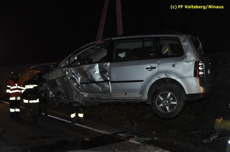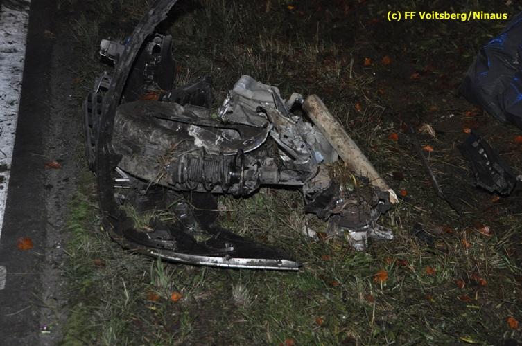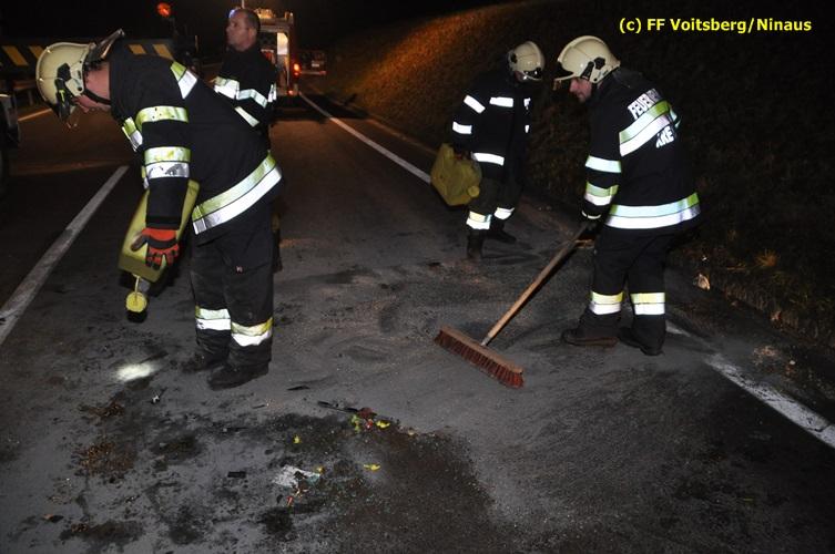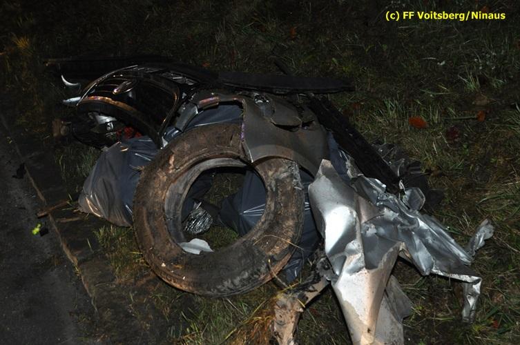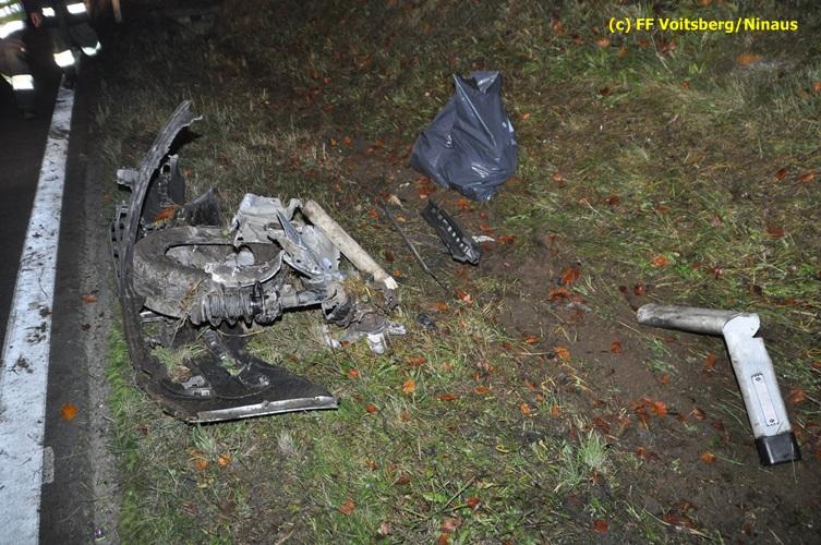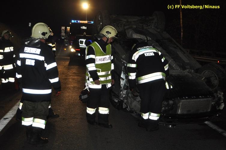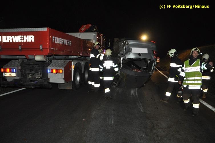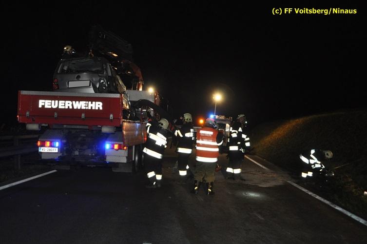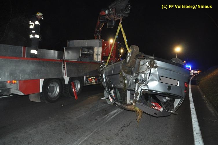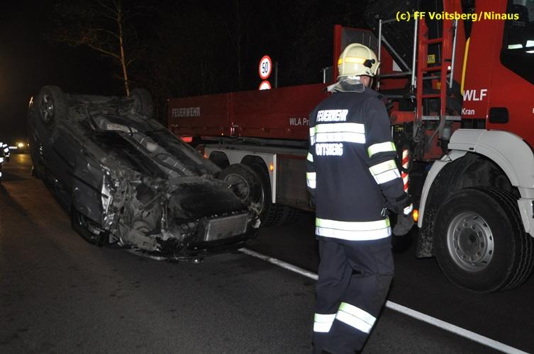 VOITSBERG, am 04.11.2015 Aus ungeklärter Ursache geriet in den Kremser Reihen ein in Richtung Graz fahrender PKW ins Schleudern, geriet auf das Bankett, überschlug sich mehrmals und kam am Dach liegend auf der Fahrbahn zu stehen. Darauffolgende Fahrzeuglenker konnten ihre Fahrzeuge gerade noch ohne eine Kollision am total beschädigten PKW vorbeimanövrieren. Beim Abkommen von der Straße wurde eine Betonplatte, welche als Kanalabdeckung diente, 15 m durch die Luft geschleudert. Weitere Wrackteile flogen Richtung Bahndamm, ohne jedoch den Zugverkehr zu behindern. Die alarmierte FF Krems sicherte die Unfallstelle ab, baute einen Brandschutz auf und band ausgeflossene Betriebsmittel mittels Bindemittel und entsorgte dieses fachgerecht. Das WLF Voitsberg barg das Autowrack und entfernte es von der Unfallstelle. Die Polizei sperrte während der Bergungs- und Aufräumarbeiten die B 70 für ca. 20 Minuten zur Gänze. Das Rote Kreuz versorgte den leicht verletzten Lenker und brachte ihn ins LKH Voitsberg.