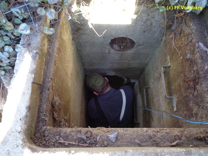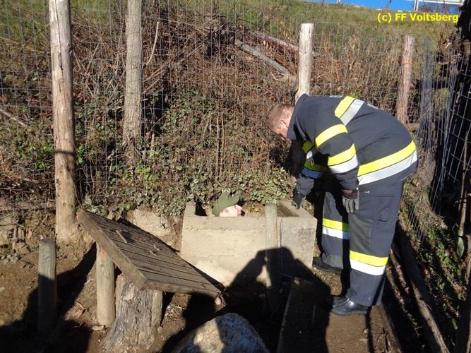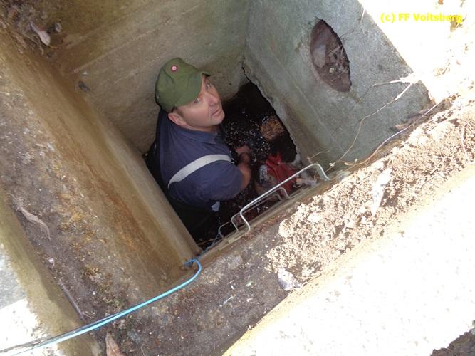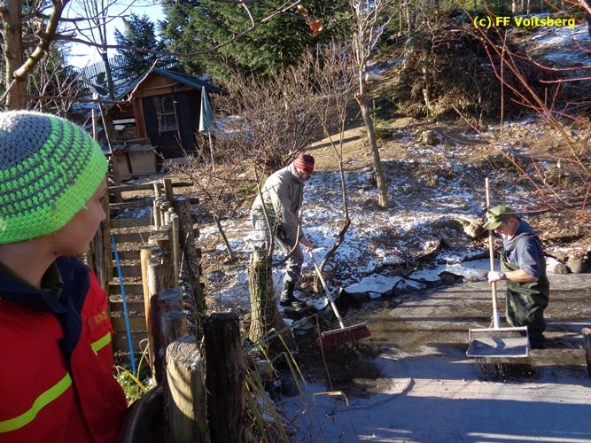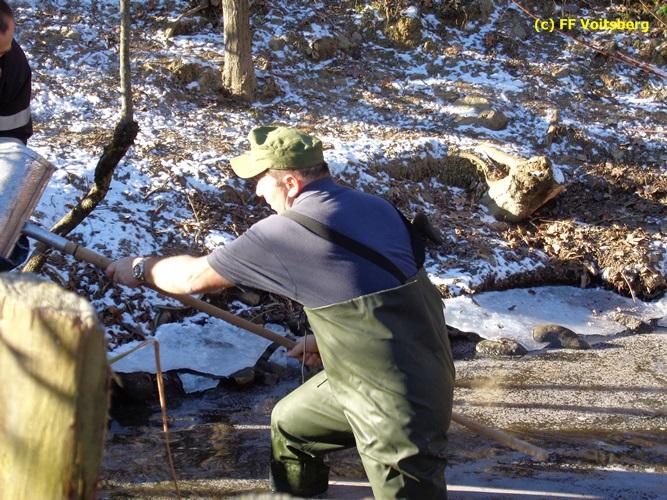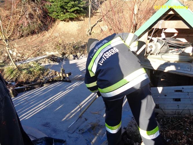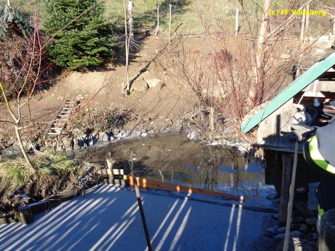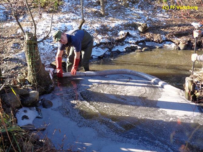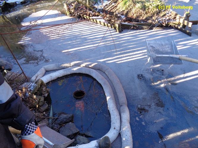 VOITSBERG, am 28.11.2015 Heizöl geriet in einen Fischteich - Errichten einer Ölsperre - Ölbindemittel wurde aufgestreut - Entsorgung des getränkten Bindemittels - Auslegen eines Flies
