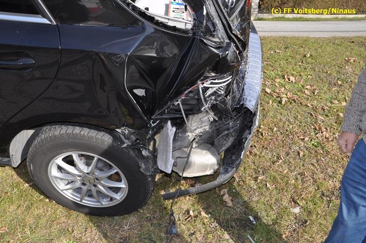 VOITSBERG, am 30.11.2015 Nach einem Auffahrunfall wurde das erste Fahrzeug ca. 30 Meter auf eine Böschung gegen einen Baum geschleudert und das zweite Fahrzeug kam auf der Gemeindestraße zu stehen. Beide Fahrzeuge wurden erheblich beschädigt und wurden von der Unfallstelle in eine nahe gelegene Werkstätte gefahren. Ausgeflossene Betriebsmittel wurden mit Bindemittel gebunden und entsorgt. Während der Aufräumungsarbeiten regelte die FF Voitsberg den Verkehr. Die anwesenden Beamten der Polizei Voitsberg führten die Unfallerhebung durch. Verletzt wurde niemand.