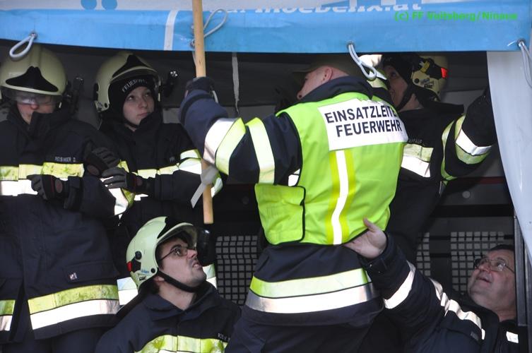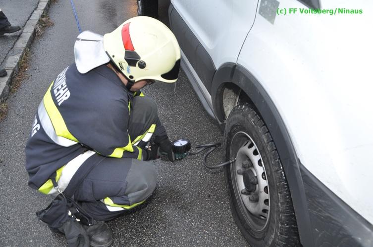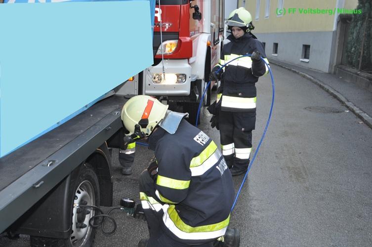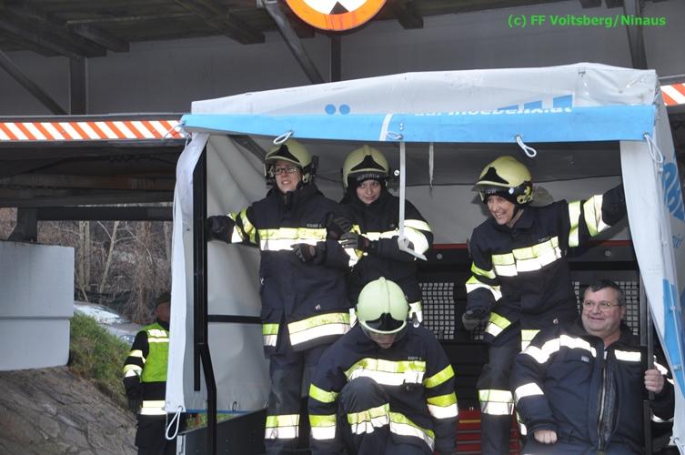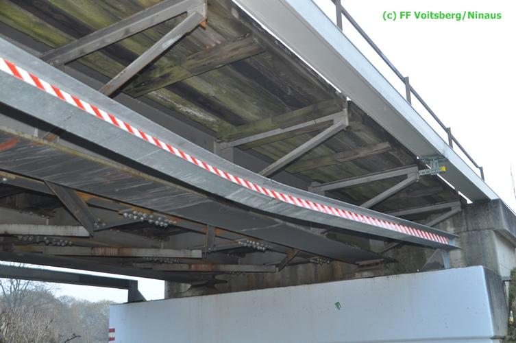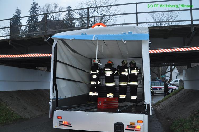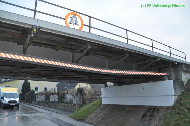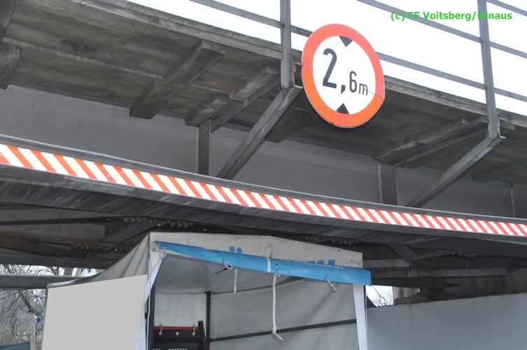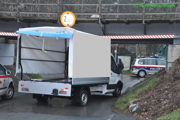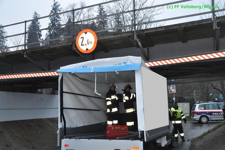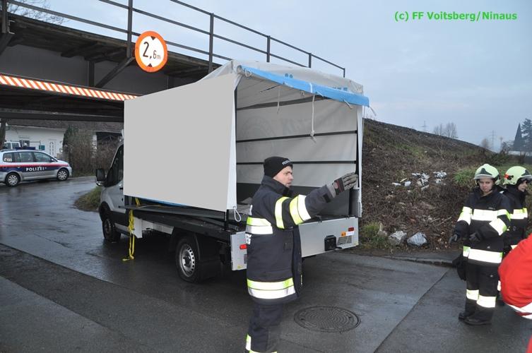 VOITSBERG, am 17.12.2015 Nachdem ein Lenker mit einem Leih-Kleintransporter die Bahnunterführung mit einer Maximalhöhe von 2,60 Meter unterschätzte, blieb er mit dem Aufbau unter der Brücke stecken und konnte weder vor noch zurück. Es wurde versucht, mittels Luftablassen das Fahrzeug zu bergen, was aber misslang. Die alarmierte FF Voitsberg lockerte den Aufbau, beschwerte die Ladefläche mit Mannes(Frauen)kraft und fuhr den Wagen unter der Brücke heraus. Nachdem mittels Kompressor des HLF 3 Tunnel der Reifendruck wieder hergestellt wurde, konnte der Lenker die Fahrt wieder fortsetzen. Am Fahrzeug und an der Brücke entstand leichter Sachschaden. Die GKB wurde seitens der Polizei verständigt.