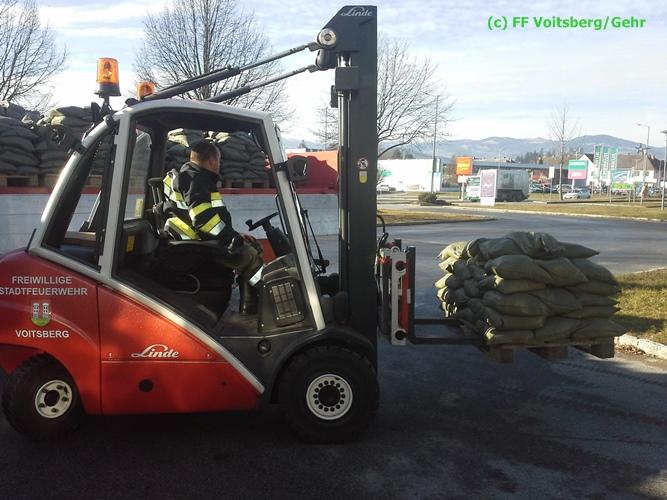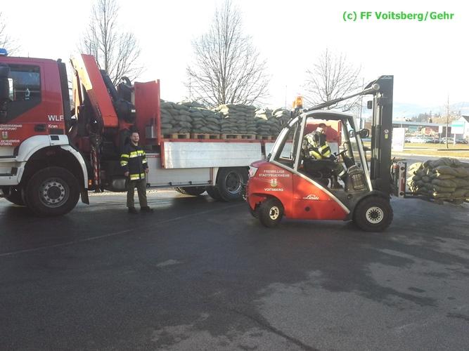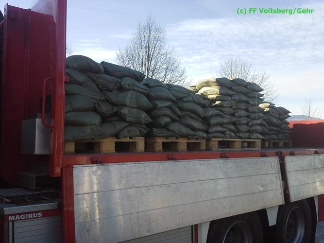VOITSBERG, am 18.12.2015 Von der bei der ÖDK – Sprengung eingesetzten Bundesheereinheit wurden der Feuerwehr 2.700 gefüllte Sandsäcke zur Verfügung gestellt. Die FF Voitsberg lieferte davon 500 Sandsäcke für ihr im heurigen Jahr errichtetes Sandsacklager an. Gefüllte Sandsäcke werden immer öfter kurzfristig bei den zunehmend auftretenden heftigen Unwettern und damit verbunden Überflutungen benötigt. Das war auch der Grundgedanke dafür, im hinteren Teil der heuer errichteten Waschbox ein Sandsacklager zu integrieren in dem nunmehr wie eingangs erwähnt, gefüllte Sandsäcke auf Paletten gelagert werden.