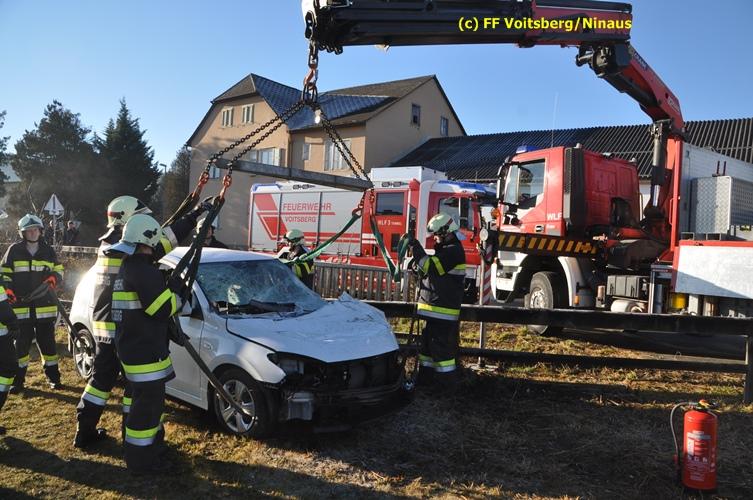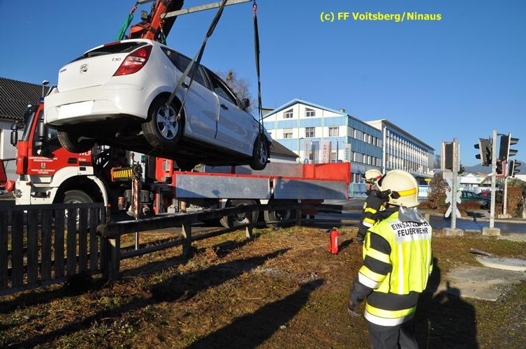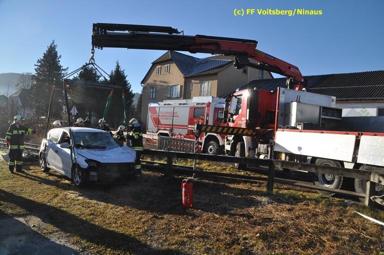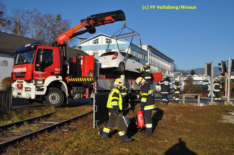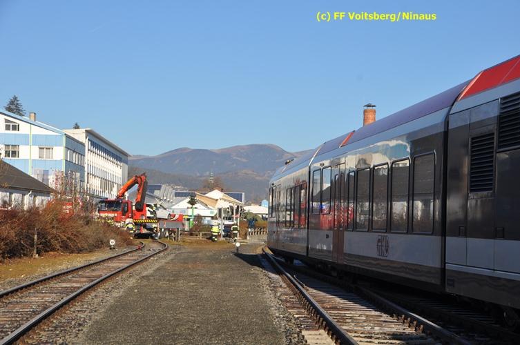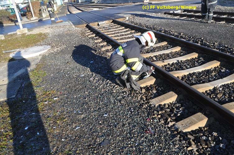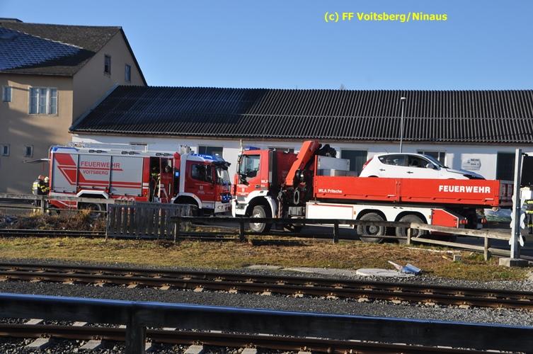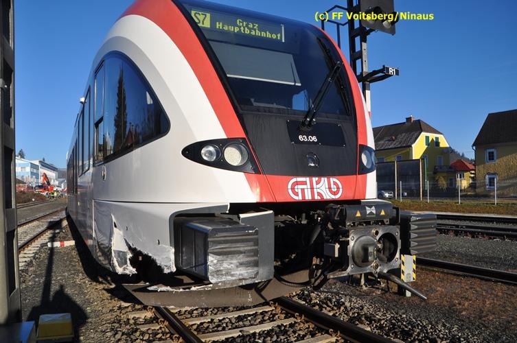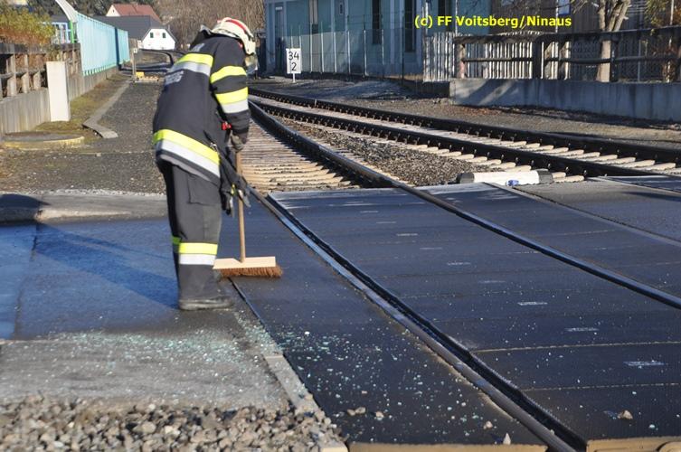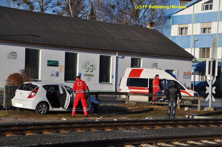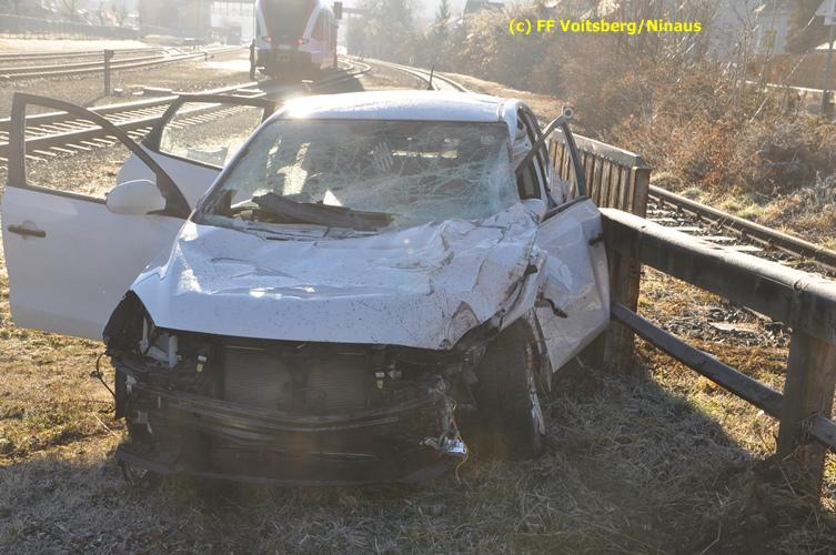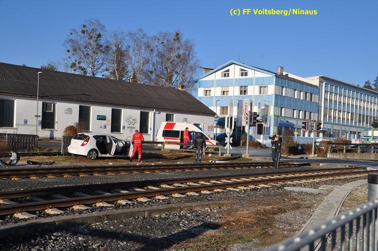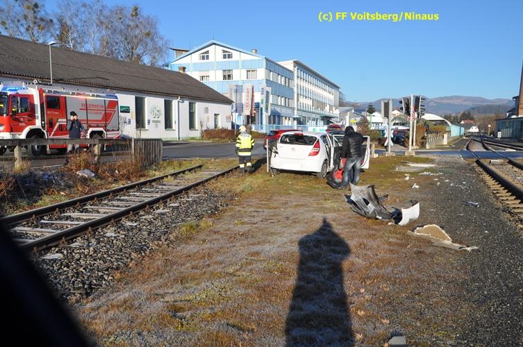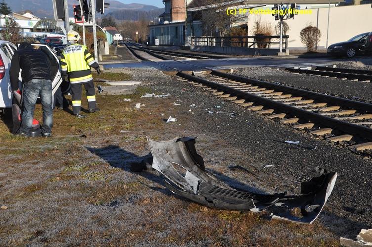 VOITSBERG, am 23.12.2015 Großes Glück hatte ein PKW-Lenker mit seinem Fahrzeug, als er in der Kowaldstrasse in Voitsberg die auf rot stehende Ampel bei der Eisenbahnübersetzung vermutlich übersah. Er wurde von dem in Richtung Graz fahrenden Personenzug im linken vorderen Bereich erfasst und zur Seite geschleudert. Wie durch ein Wunder konnte der Lenker das Fahrzeug selbständig verlassen und wurde zum Glück nur leicht verletzt und vom Roten Kreuz ins LKH Voitsberg eingeliefert. Die Aufräumungs- und Bergungsarbeiten wurden von der Stadtfeuerwehr Voitsberg durchgeführt. Die Polizei Voitsberg führte die Erhebungen durch. Die ebenfalls alarmierte FF Krems war als Reserve am Einsatzort. Am Triebwagen der GKB entstand leichter Sachschaden. Fahrgäste wurden nicht verletzt.