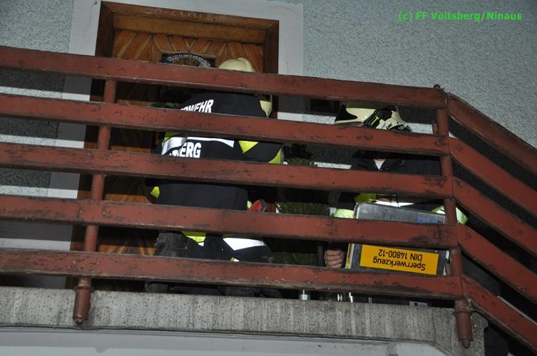 VOITSBERG, am 26.12.2015 Nachdem eine ältere Frau in ihrer Wohnung stürzte und sich dabei leicht verletzte, konnte sie nicht zum Telefon gelangen, um Hilfe zu holen. Nachbarn hielten Nachschau und hörten die Hilferufe aus der versperrten Wohnung und alarmierten Rettung, Feuerwehr und Polizei. Die FF Voitsberg öffnete die Eingangstüre und stieg gleichzeitig nach Öffnen eines Fensters in die Wohnung ein. Das Rote Kreuz versorgte die Frau und brachte sie ins LKH Voitsberg.