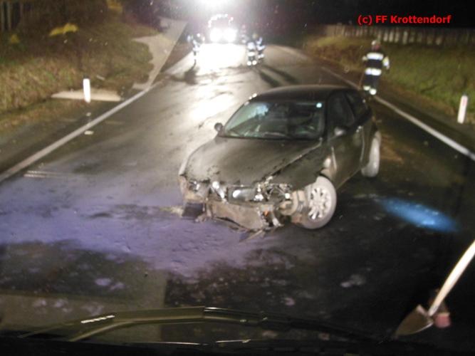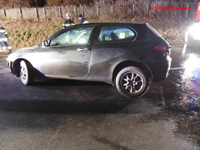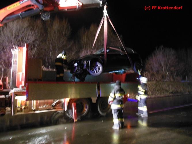 VOITSBERG, am 30.12.2015 Aus ungeklärter Ursache touchierte ein PKW auf der Umfahrungsstrasse Krottendorf eine Leitschiene und geriet auf die andere Straßenseite, wo er ebenfalls aufprallte. Das schwer beschädigte Fahrzeug wurde mit dem WLF-Kran von der Unfallstelle zu einem Parkplatz gebracht und abgestellt. Am Einsatz beteiligt waren weiter die FF Gaisfeld und die FF Krottendorf.