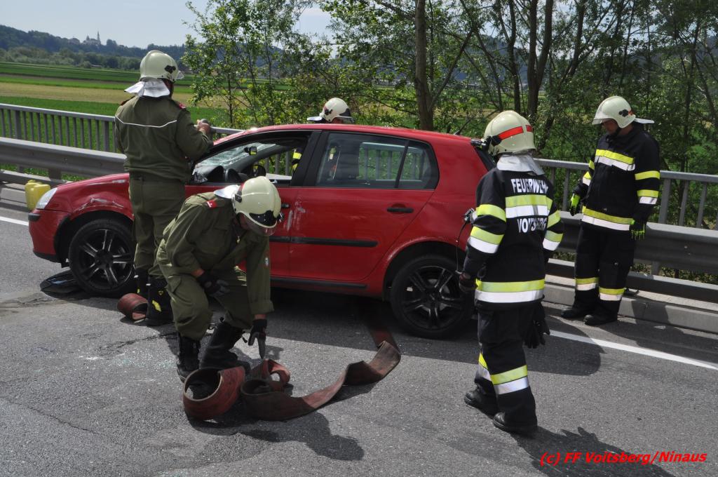 VOITSBERG, am 18.05.2016 Aus ungeklärter Ursache geriet eine Lenkerin mit ihrem PKW am Mittwochvormittag auf der Umfahrungsstraße Krottendorf der B 70 auf eine Leitschiene, schlitterte einige Meter mit den rechten Rädern darauf, kippte um und kam mit den Rädern nach oben in Mitte der viel befahreren B 70 zu liegen. Glücklicherweise herrschte zu diesem Zeitpunkt kein Gegenverkehr, sodass Schlimmeres ausblieb. Die Lenkerin wurde mit leichten Verletzungen am Unfallort vom Notarzt erstversorgt und ins LKH Voitsberg eingeliefert. Das beschädigte Fahrzeug wurde mit dem WLF-Kran der FF Voitsberg geborgen und von der Unfallstelle entfernt. Die Feuerwehren Gaisfeld und Krottendorf sicherten die Unfallstelle ab und reinigten die Fahrbahn von ausgeflossenen Betriebsmitteln mit Bindemittel und entsorgten dieses fachgerecht. Die Polizei sperrte während der Bergungsarbeiten die Umfahrung und richtete eine Umleitung über die alte Bundesstraße ein.