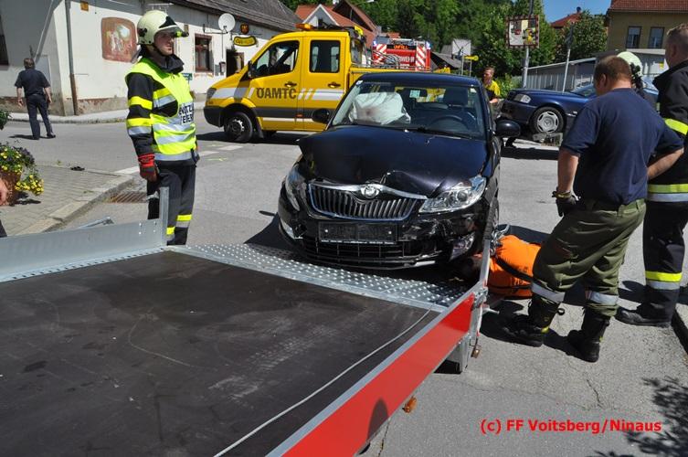 VOITSBERG, am 17.06.2016 Vermutlich nach Mißachtung eines Vorrangzeichens kam es zu einem Zusammenstoß zweier PKW. Während der sich allein im Fahrzeug befindliche Lenker eines Fahrzeuges selbst befreien konnte, mußten zwei Insassen des zweiten Unfallfahrzeuges im Fahrzeug vom Notarzt erstversorgt werden, ehe beide in Zusammenarbeit zwischen dem Roten Kreuz und der Feuerwehr gerettet und mit zwei RTW mit Verletzungen unbestimmten Grades ins Krankenhaus eingeliefert wurden. Die FF Voitsberg führte gemeinsam mit der Polizei die Verkehrsregelung durch. Ein Fahrzeug wurde vom einem Autofahrerklub und das zweite von der FF Voitsberg mittels Mehrzweckanhängers von der Unfallstelle entfernt.