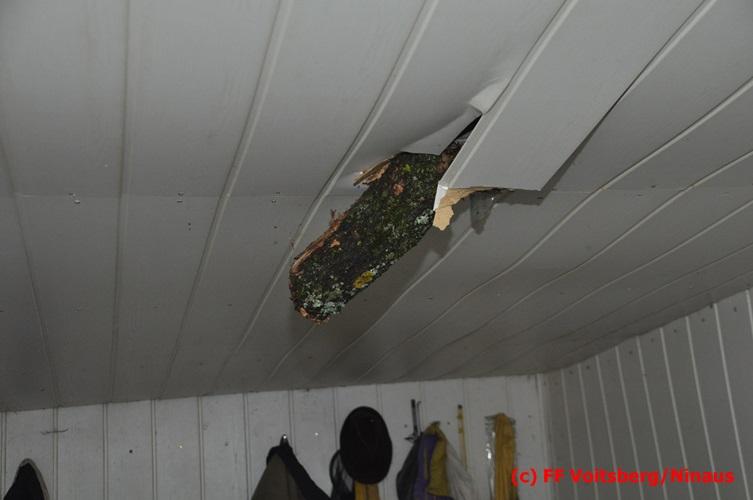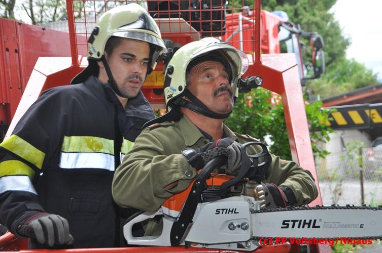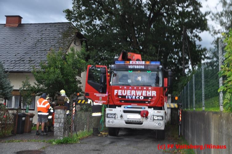VOITSBERG, am 05.08.2016 Nach einem Sturm fielen Baumteile und Äste auf die Stromleitung eines Wohnhauses. Es bestand Gefahr in Verzug, da sich weitere Baumteile anstellten, abzubrechen. Ein Zutritt zum Grundstück war deshalb sehr gefährlich und nicht verantwortbar, sodass Kameraden mit Hilfe des WLF-Korbes den fast 100 Jahre alten Baum von den morschen Ästen befreiten. Der Inspektionsdienst der Stadtwerke Voitsberg musste während der Schneidearbeiten den Strom in diesem Gebiet für einige Stunden abschalten.