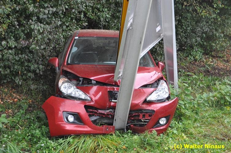 VOITSBERG, am 02.10.2016 In einer unfallträchtigen Kurve der LB 70 in den Kremser Reihen Fahrtrichtung Voitsberg geriet ein PKW von der Straße ab, prallte gegen einen Wegweiser und riss diesen aus seiner Verankerung. Das Fahrzeug verkeilte sich derart, dass der Einsatz des WLF-Kran erforderlich war. Das schwer beschädigte Fahrzeug wurde geborgen und von der Unfallstelle gebracht. Die einsatzleitende Feuerwehr Krems sicherte die Unfallstelle in Zusammenarbeit mit der Polizei ab und barg herumliegende Wrackteile des Fahrzeuges sowie Teile des Wegweisers.