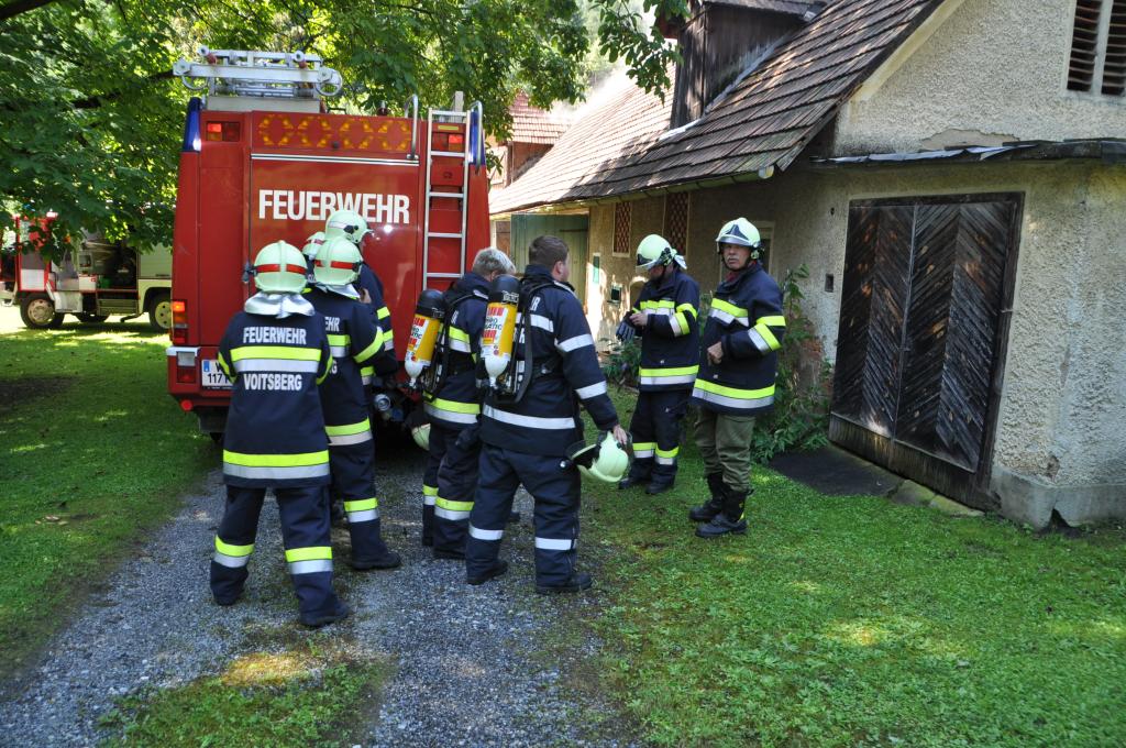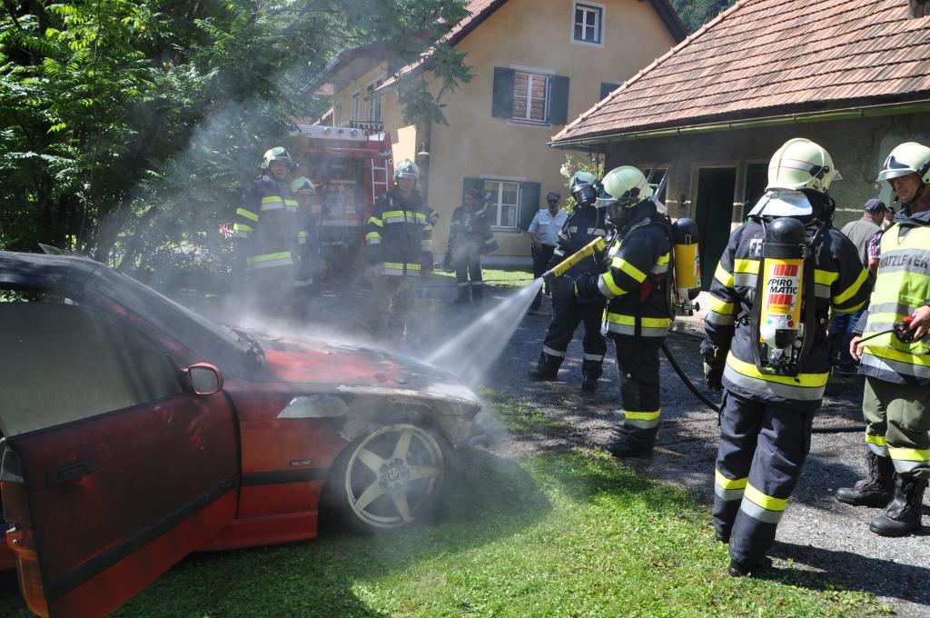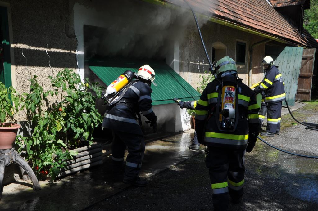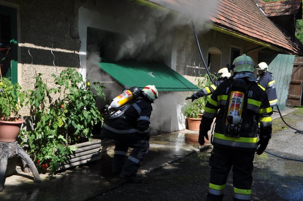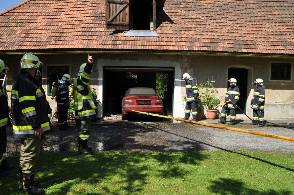 VOITSBERG, am 21.08.2014 Aus ungeklärter Ursache geriet ein PKW in einer verschlossenen Garage mit angebautem Wirtschaftsgebäude in Brand. Nachbarn bemerkten das Feuer und alarmierten die Einsatzkräfte, welche nach der Erkundung den hinteren Eingang gewaltsam öffneten, aber aufgrund der hohen Hitzeentwicklung nicht vordringen konnten. Deshalb wurde über dem vorderen Einfahrtstor ein Brandangriff unter schwerem Atemschutz durchgeführt. Der Brand war schnell unter Kontrolle. Das Wirtschaftsgebäude konnte durch den raschen Löscheinsatz gerettet werden. Das ausgebrannte Fahrzeug wurde mittels Seil geborgen. Im Freien wurde dann der Löscheinsatz abgeschlossen. Das Rote Kreuz Voitsberg war mit einem Team Vorort, wie auch die Polizei Voitsberg, welche die Erhebungen durchführte.