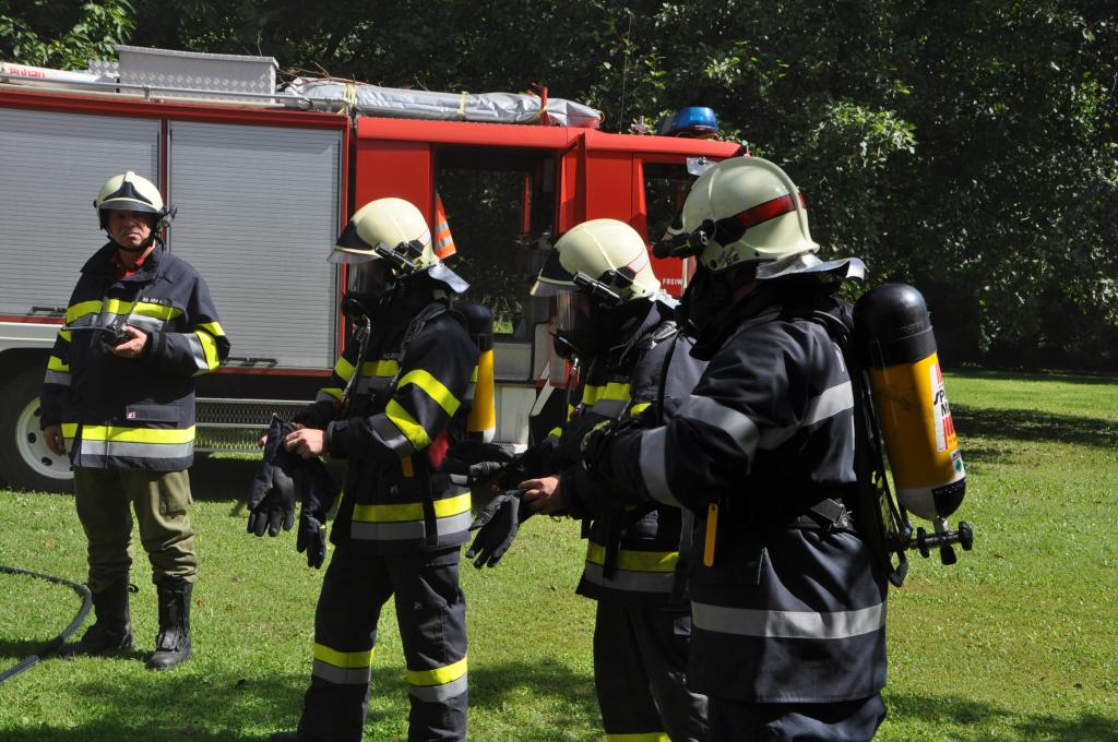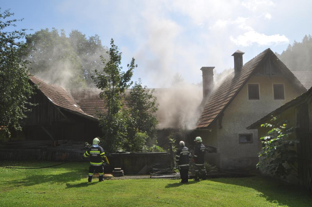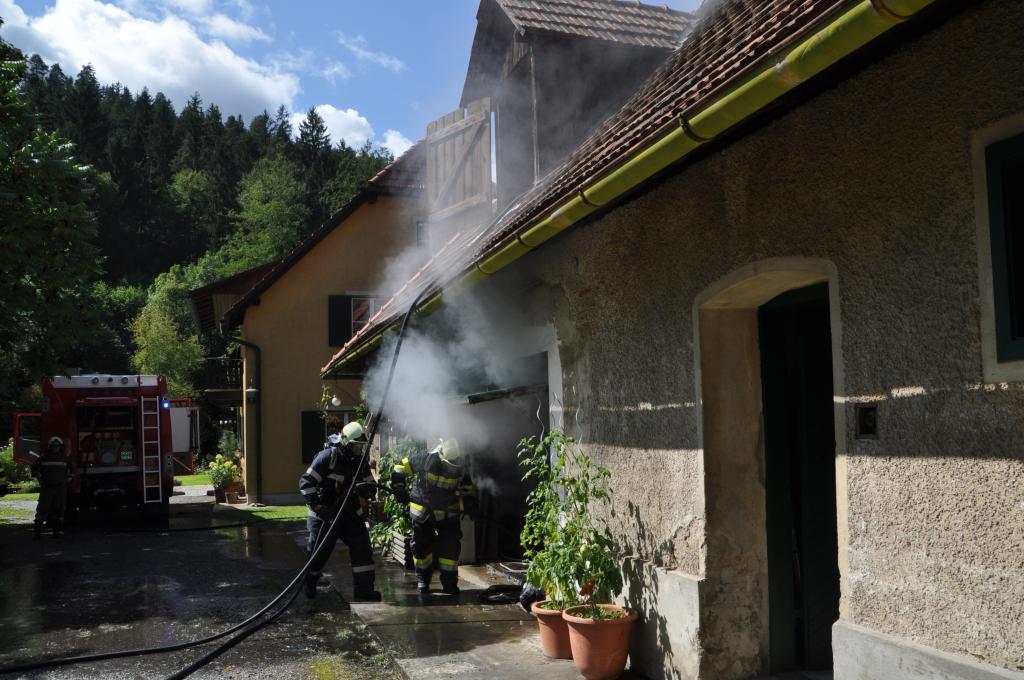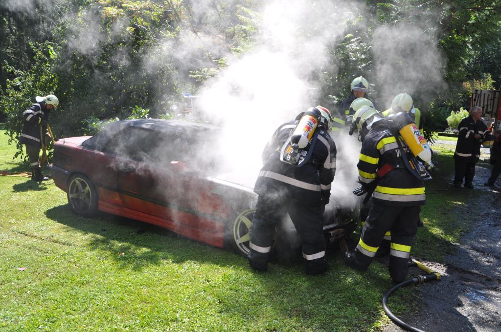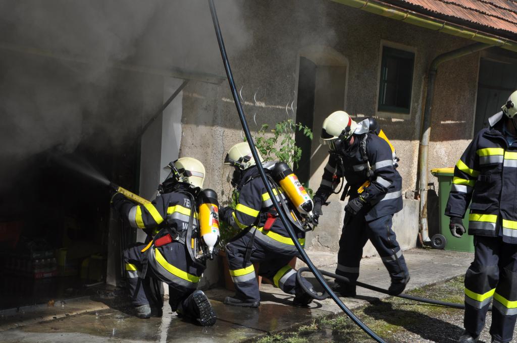VOITSBERG, am 21.08.2014 Aus ungeklärter Ursache geriet ein PKW in einer verschlossenen Garage mit angebautem Wirtschaftsgebäude in Brand. Nachbarn bemerkten das Feuer und alarmierten die Einsatzkräfte, welche nach der Erkundung den hinteren Eingang gewaltsam öffneten, aber aufgrund der hohen Hitzeentwicklung nicht vordringen konnten. Deshalb wurde über dem vorderen Einfahrtstor ein Brandangriff unter schwerem Atemschutz durchgeführt. Der Brand war schnell unter Kontrolle. Das Wirtschaftsgebäude konnte durch den raschen Löscheinsatz gerettet werden. Das ausgebrannte Fahrzeug wurde mittels Seil geborgen. Im Freien wurde dann der Löscheinsatz abgeschlossen. Das Rote Kreuz Voitsberg war mit einem Team Vorort, wie auch die Polizei Voitsberg, welche die Erhebungen durchführte.