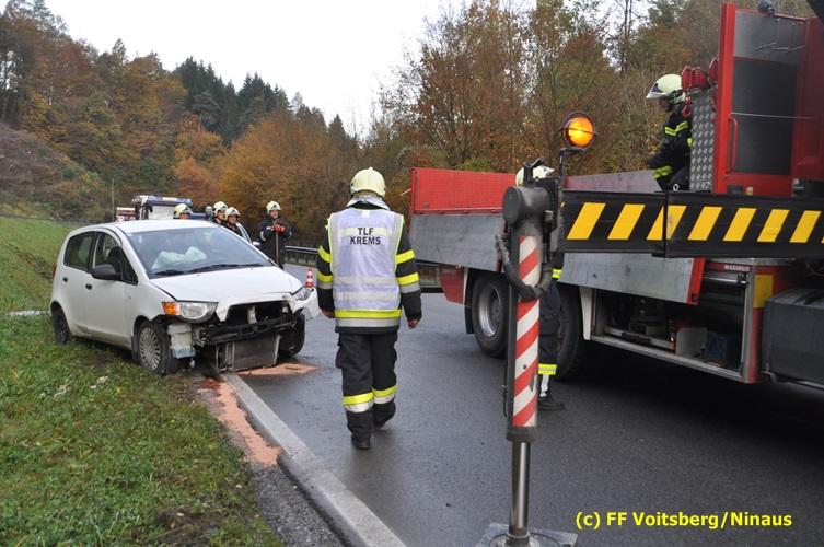 VOITSBERG, am 25.10.2016 Ein PKW geriet aus unbekannten Gründen in Fahrtrichtung Graz in den Kremser Reihen rechts von der Straße ab, fuhr auf die Böschung zum Bahndamm, schleuderte zurück auf die Bundesstraße und kam schwer beschädigt dort zu stehen. Durch die Wucht des Aufpralls wurde der Motorblock aus der Verankerung gerissen. Die FF Krems baute einen Brandschutz auf, band ausgeflossene Betriebsmittel und sicherte die Unfallstelle ab. Die Bergung erfolgte mit dem WLF-Kran.