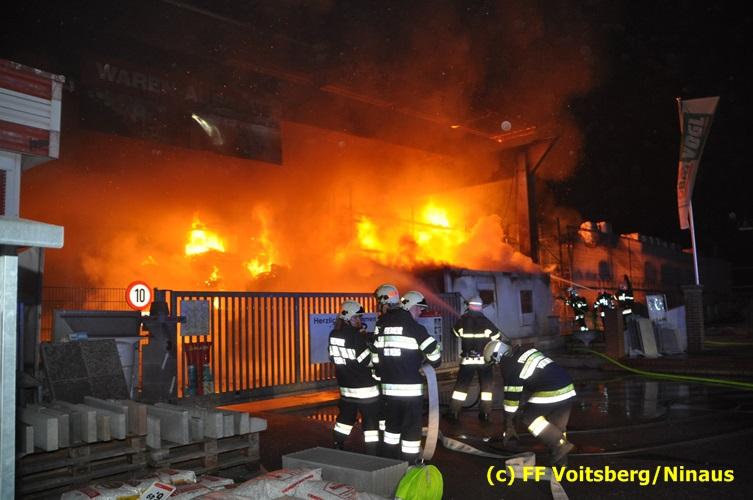 VOITSBERG, am 05.11.2016 Im Freigelände des Baustofflagers der Firma Hagebau Vogl in Rosental brach aus unbekannter Ursache ein Brand aus. Die Alarmierung der zuständigen Feuerwehr Rosental erfolgte nach dem Auslösen der Brandmeldeanlage durch die LLZ n Lebring. Bereits bei der Anfahrt wurde seitens des Einsatzleiters Großalarm ausgelöst. Ein Bürocontainer sowie ca. 200 m Regale standen in Vollbrand. Es drohte auch ein Übergriff auf das angrenzende Geschäft mit Büros, was aber durch den gezielten Einsatz der Feuerwehren verhindert werden konnte. Der Brand konnte nach einer halben Stunde unter Kontrolle gebracht werden. Durch den raschen Einsatz mit Tanklöschfahrzeugen und der Drehleiter konnte Ärgeres verhindert werden. Das Löschwasser musste aus einer Entfernung von ca. 300 m aus einem Teich gepumpt werden.