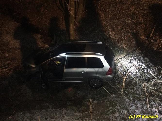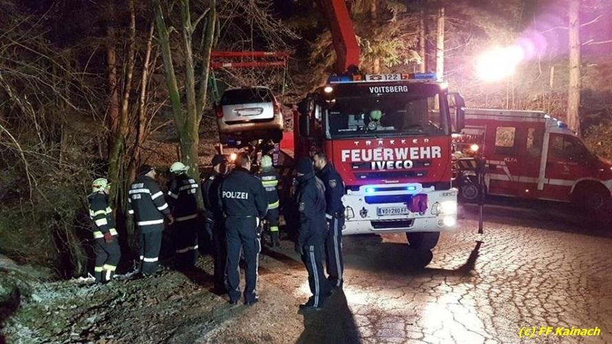 VOITSBERG, am 22.12.2016 Ein PKW kam in einer scharfen Kurve von der Fahrbahn ab und stürzte ca. 3 m tief in den Straßengraben. Der Lenker wurde mit Verletzungen unbestimmten Grades ins LKH Voitsberg eingeliefert. Am Fahrzeug entstand Totalschaden. Die Bergung erfolgte mit dem WLF-Kran der FF Voitsberg in Zusammenarbeit mit der FF Kainach.