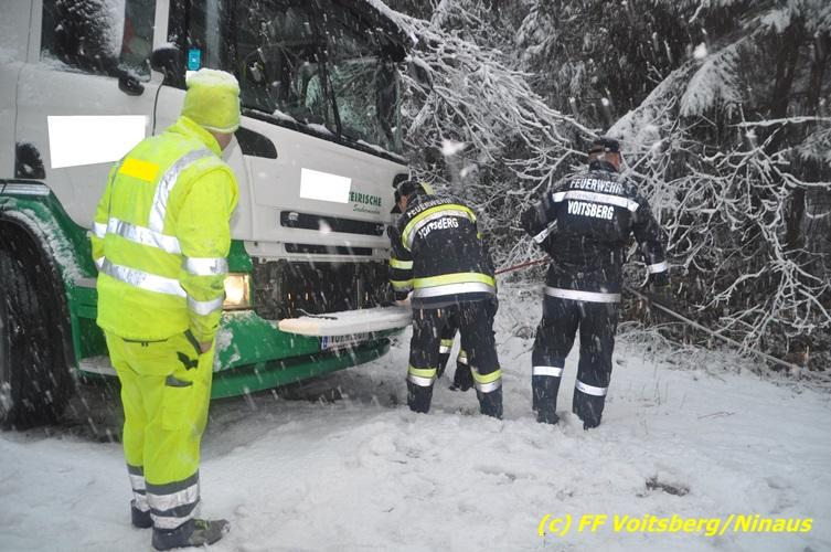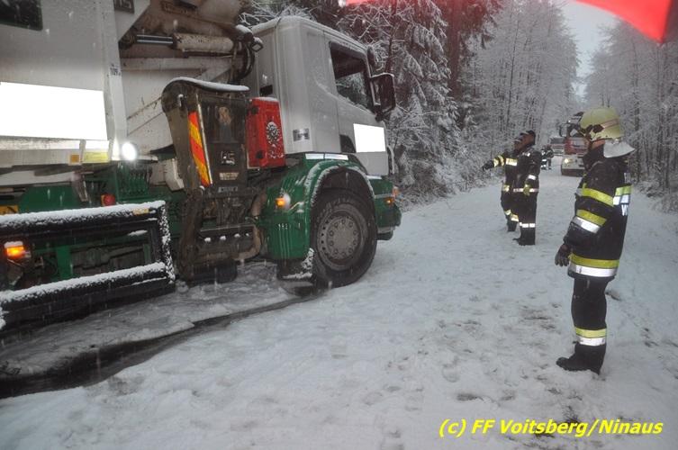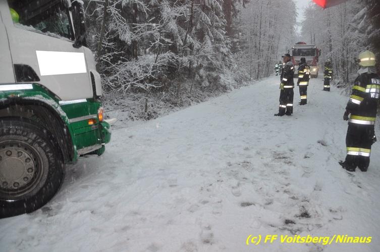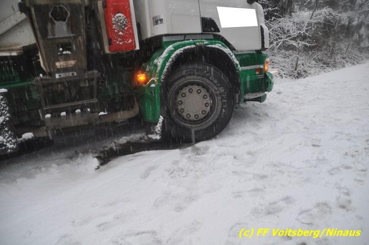 VOITSBERG, am 13.01.2017 Ein LKW kam auf der schneeglatten Fahrbahn ins Rutschen und geriet in einen Graben. Die Stadtfeuerwehr Voitsberg barg den 25 to schweren LKW mittels Seilwinde des WLF-Kran. Das Fahrzeug blieb unbeschädigt und konnte die Fahrt auf eigener Achse fortsetzen. Insgesamt war die FF Voitsberg mit 11 Einsatzkräften und 2 Fahrzeugen im Einsatz.