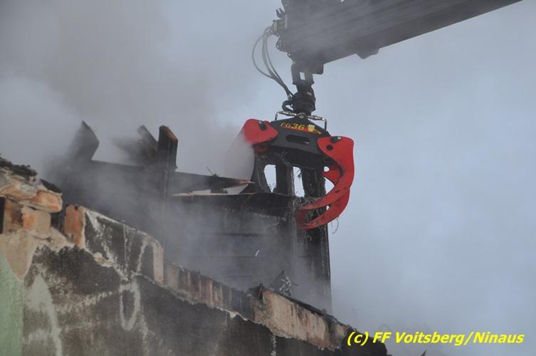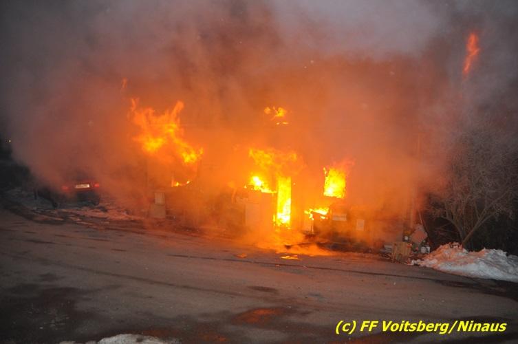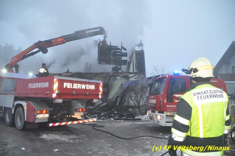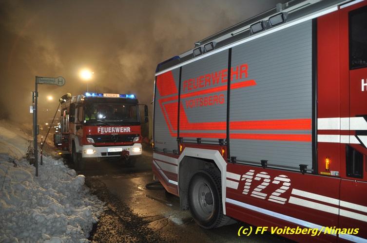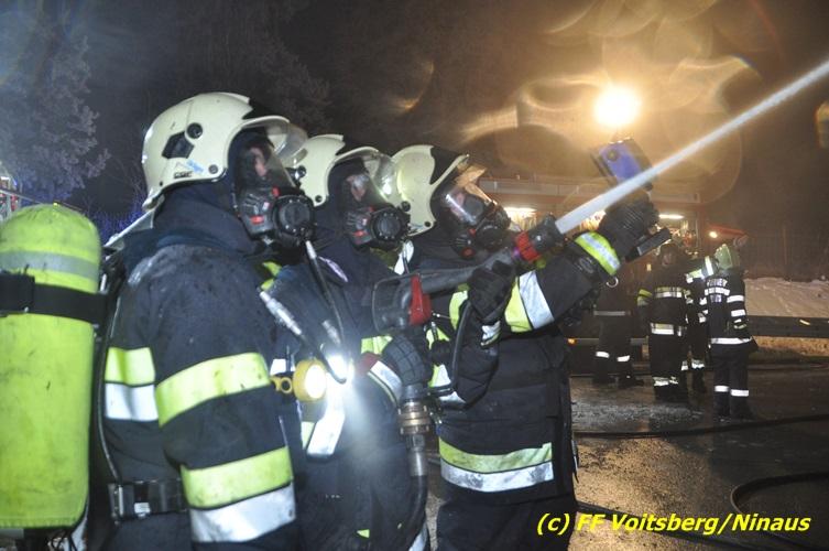 VOITSBERG, am 29.01.2017 Am Sonntag, 29. Jänner 2017 um 00:25 Uhr wurden die Feuerwehren Voitsberg, Krems, Bärnbach, Köflach und Rosental zu einem Wohnhausbrand in Voitsberg alarmiert. Bei Eintreffen am Einsatzort war das Wohnhaus bereits in Vollbrand. Unter schwerem Atemschutz wurde zuerst von außen mit 3 HD-Rohren eine Brandbekämpfung durchgeführt, ehe der Weg für einen Innenangriff frei wurde. Die Mannschaft stellte kurz nach Eindringen in das Haus fest, dass dort sehr viel Material gelagert war. Da der Brandangriff aus diesem Grund nur oberflächlich durchgeführt werden konnte, loderten immer wieder Flammen auf, sodass der Innenangriff abgebrochen werden musste. Um eine effiziente Brandbekämpfung durchführen zu können, musste man über Leiterwege und über die Drehleiter Köflach die Außenangriffe mittels Schaummittel fortsetzen, was aber nur zum Teil gelang, da aufgrund des gelagerten Materials ein Herankommen an die Brandherde nicht überall möglich war. Weiter wurde versucht, mit einer Seilwinde den Dachstuhl abzutragen, was aber aufgrund des angebrannten Holzes zu wenig Erfolg führte. Schlussendlich wurde mittels des WLF Voitsberg und Holzgreifer der Dachstuhl zum Teil abgetragen, um besser zu den Brandherden heranzukommen. Erschwerend wirkte sich die klirrende Kälte aus. Durch das Löschwasser war die gesamte Umgebung derart vereist, dass man Streusalz aufbringen musste. Auch die Leitern waren sehr vereist, was zu großer Vorsicht für die Mannschaft bedeutete. Glück im Unglück hatte die Besitzerin des Hauses. Sie entdeckte den Brand, nachdem sie nachhause kam. Sie versuchte diesen noch mit Schnee zu löschen, was klarerweise nicht gelang. Das Haus wird mit hoher Wahrscheinlichkeit nicht mehr bewohnbar. An der Brandbekämpfung beteiligten sich 5 Feuerwehren mit 16 Fahrzeugen und 77 Einsatzkräften. Ein Kamerad verletzte sich bei den Löscharbeiten an der Hand. Weiter waren das Rote Kreuz Voitsberg mit einem RTW und zwei Helfern sowie die Polizei mit einer Streife anwesend. Die Brandursache und die Schadenshöhe sind noch nicht bekannt.