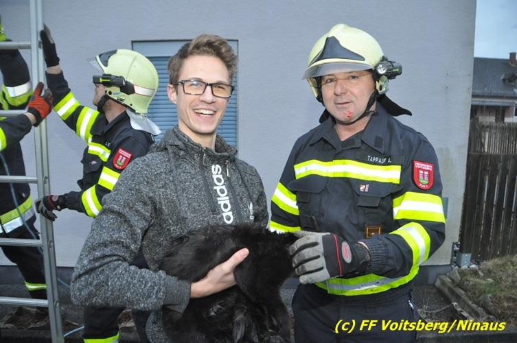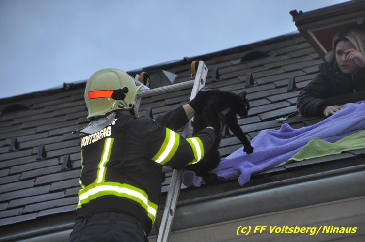 VOITSBERG, am 01.03.2017 Eine Katze geriet aus unerklärlichen Gründen durch ein Fenster einer Dachgaube im dritten Obergeschoss auf das Dach und rutschte in eine Dachrinne. Die Besitzer versuchten mit Tüchern einen Rückweg für das Tier herzustellen, was aber von der Katze nicht angenommen wurde. Über die LLZ Steiermark wurde die FF Voitsberg zur Tierrettung alarmiert. Über eine Schiebeleiter wurde das verängstigte Tier schlussendlich von einem Kameraden eingefangen und zu Boden gebracht. Bei der Rettung wurde der Kamerad von der Katze im Gesicht leicht verletzt. Der überglückliche Mitbesitzer konnte das nervöse, aber unverletzte Tier von der Feuerwehr übernehmen und den Dank an die Einsatzkräfte aussprechen.