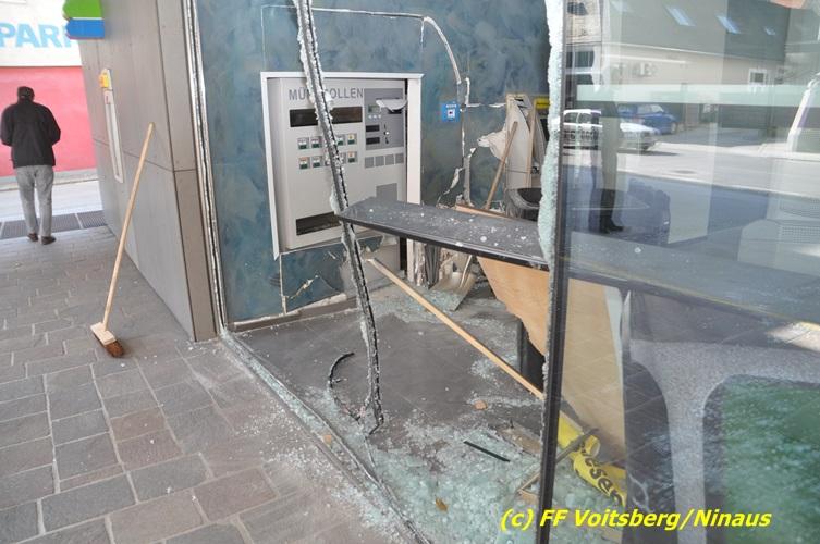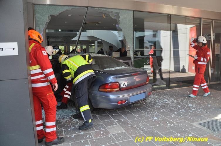 VOITSBERG, am 20.04.2017 Plötzlich stand ein PKW in der Bank Am Donnerstag, 20. April 2017 kurz vor 9 Uhr durchbrach ein PKW das Glasportal der Raiba - Hauptanstalt in Voitsberg, nachdem der Lenker vermutlich das Gaspedal anstatt dem Bremspedal betätigte. Das Fahrzeug kam im Schalterraum der Bank so zu stehen, dass die Fahrertür des Unfallfahrzeuges nicht geöffnet werden konnte. Die FF Voitsberg barg das schwer beschädigte Fahrzeug, ehe der Lenker von Helfern des Roten Kreuzes gerettet werden konnte. Der Mann erlitt einen Schock und wurde ins LKH Voitsberg eingeliefert. Während der Bergungsarbeiten wurde ein zweifacher Brandschutz aufgebaut. Die ebenfalls alarmierte FF Krems war an der Einsatzstelle als Reserve anwesend. Die Erhebungen wurden von der Polizei Voitsberg durchgeführt. Während des Einsatzes kam es im Voitsberger Stadtgebiet kurz zu einem Stau. Großes Glück hatten zwei Personen, welche kurz vor dem Unfall in der Bank Geldautomaten betätigten und unversehrt blieben. Der Sachschaden am Gebäude und der Einrichtung ist enorm. Eingesetzt waren 11 Kräfte der FF Voitsberg unter Einsatzleiter ABI Ing. Klaus Gehr, das Rote Kreuz Voitsberg mit 6 Helfern und die Polizei Voitsberg mit 2 Beamten. Walter Ninaus, FF Voitsberg (Text und Fotos)