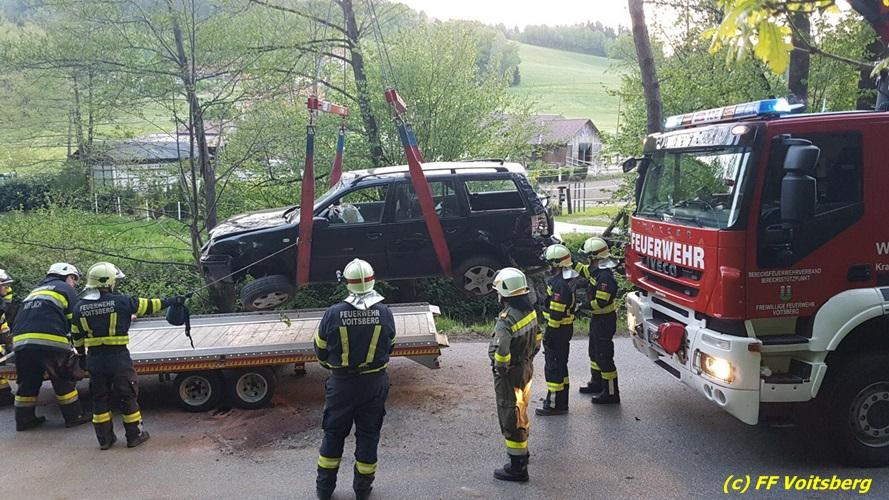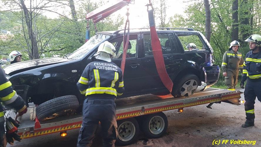 VOITSBERG, am 10.05.2017 Ein PKW kam von einer Landesstrasse ab, touchierte einen Felsen und einen Strommasten, überschlug sich und kam schwer beschädigt auf der Straße zu stehen. Das schwer beschädigte Fahrzeug wurde mit dem WLF-Kran auf einen Abschleppanhänger für den Abtransport verladen.