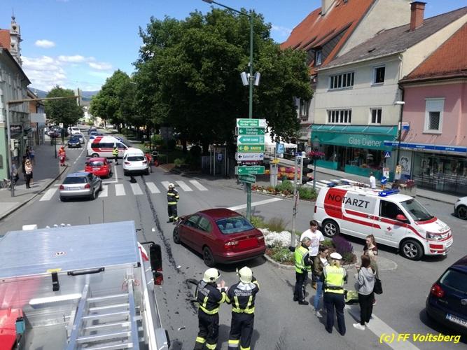 VOITSBERG, am 25.05.2017 Die Feuerwehren Voitsberg und Krems wurden mit dem Einsatzbefehl „Verkehrsunfall mit Menschenrettung am Hauptplatz Voitsberg“ alarmiert. Am Einsatzort angekommen konnte Einsatzleiter ABI Ing. Klaus Gehr feststellen, dass glücklicherweise keine Personen in den Fahrzeugen eingeklemmt waren. So war es Aufgabe der Feuerwehr, die Einsatzstelle abzusichern, den Brandschutz aufzubauen und die ausgelaufenen Betriebsmittel zu binden. Die verunfallten Fahrzeuge wurden mit dem WLF-K sowie mit dem Mehrzweckanhänger aus dem Gefahrenbereich verbracht. Nach gut einer Stunde war der Einsatz für die Feuerwehr beendet.