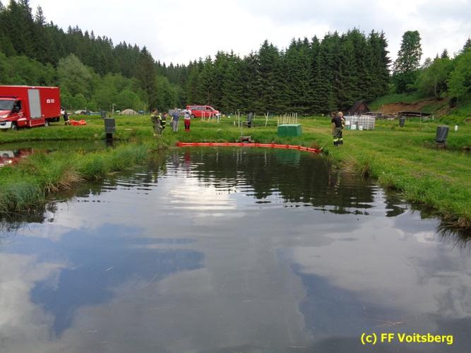 VOITSBERG, am 01.06.2017 Nach einem Verkehrsunfall auf der A2 gelangte Diesel in einen Bach. Der Treibstoff lief in Fischteiche. Errichten von 6 Ölsperren, um eine weitere Gefährdung anschließender Fischteiche und des Fischwassers zu verhindern. Die Ölsperren wurden gesichert und vor Ort gelassen.