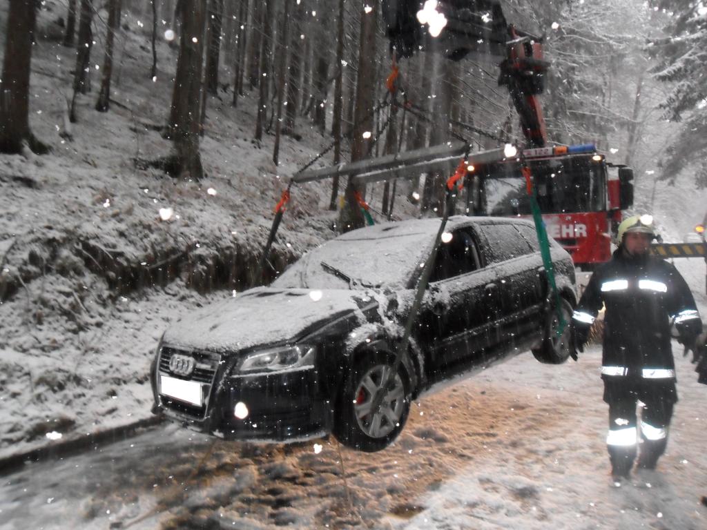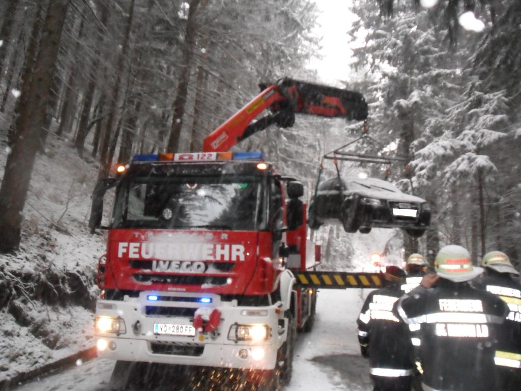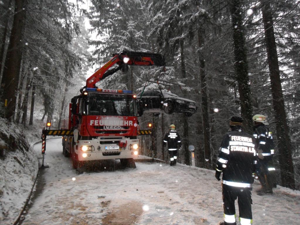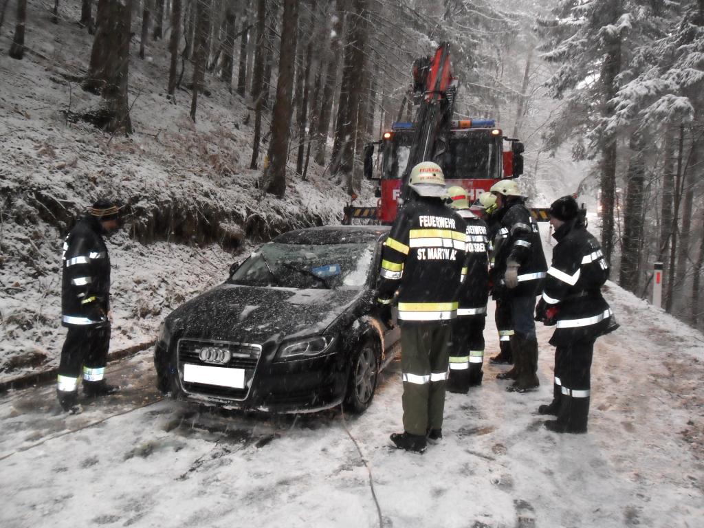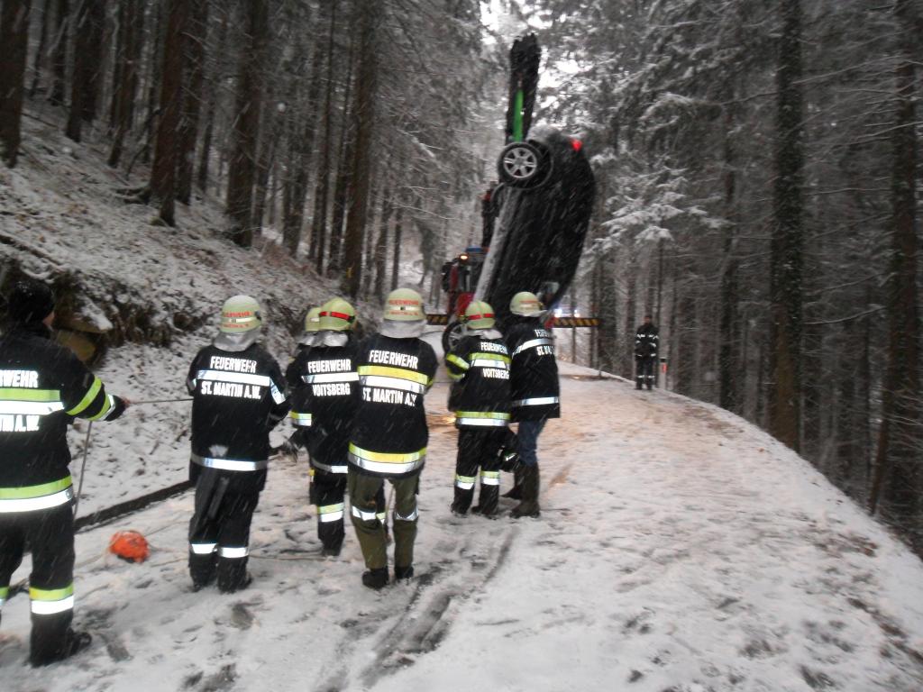 VOITSBERG, am 30.01.2015 Aus ungeklärter Ursache geriet eine Lenkerin mit ihrem PKW rechts von der Straße ab, schlitterte einer Böschung entlang und kam auf der Landesstraße am Dach zu liegen, blieb aber zum Glück unverletzt. Die einsatzleitende Feuerwehr St.Martin verständigte zwecks Bergung das WLF-K Voitsberg an, mit welchem das Fahrzeug geborgen und abtransportiert wurde.