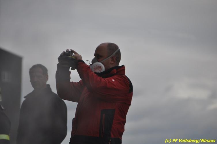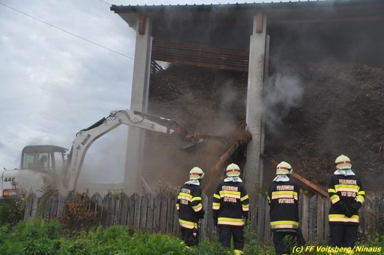 VOITSBERG, am 27.10.2017 In den frühen Morgenstunden wurde im Hackschnitzellager eines Biomasse-Heizwerkes einer Firma in Bärnbach aufsteigender Rauch entdeckt. Die alarmierten Feuerwehren Bärnbach und Voitsberg führten Erstmaßnahmen in Form von Kühlen der Verkleidung durch, um ein Ausbrechen eines Großbrandes zu verhindern. Inzwischen verständigte und eingetroffene schwere Gerätschaften begannen mit dem Ausräumen des laut Besitzers mit ca. 6.000 m³ Hackschnitzel befüllten Lagers. Auf der Ostseite des Areals wurden drei Felder der aus Holz bestehenden Wand entfernt und mit dem Ausräumen und Löschen begonnen. Der inzwischen eingetroffene Sachverständige und die Brandermittlung der Polizei konnten als Brandursache Selbstentzündung feststellen. Ein weiteres Übergreifen auf andere Teile der Halle konnte verhindert werden. Der Sachschaden ist noch nicht bekannt. Seitens der Feuerwehren waren unter der Einsatzleitung von OBI Michael Witreich (FF Bärnbach) insgesamt 28 Kameraden der Feuerwehren Bärnbach und Voitsberg im Einsatz.