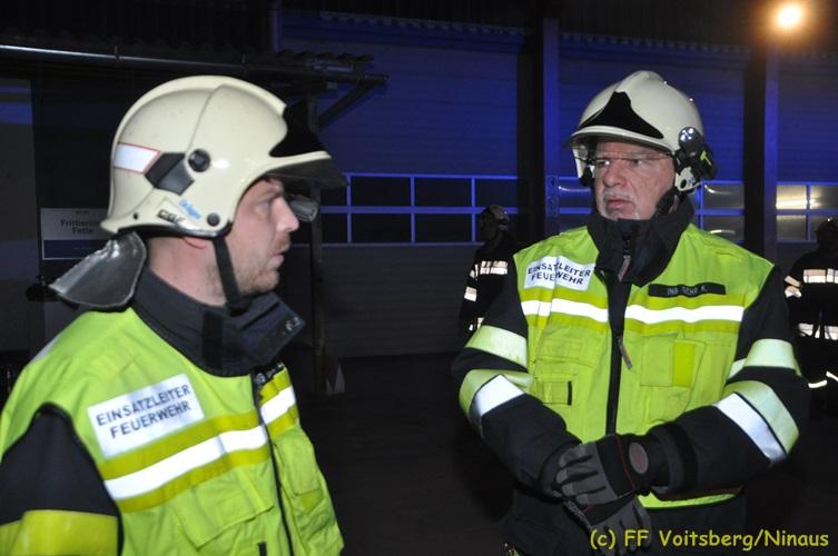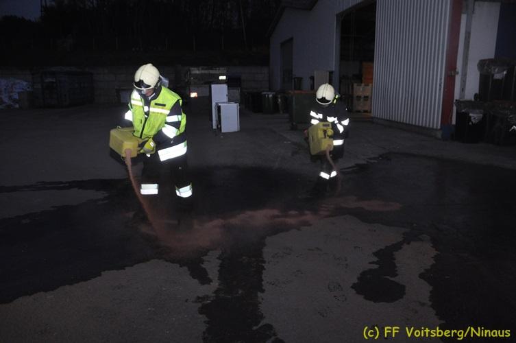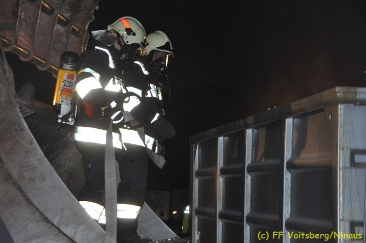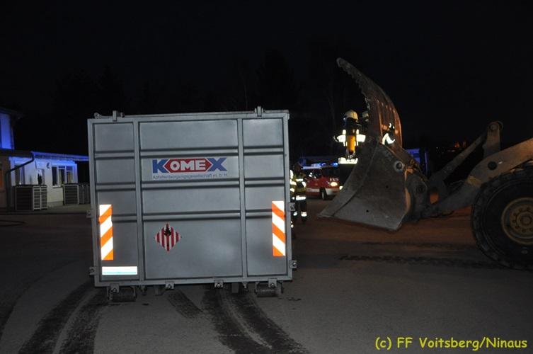 VOITSBERG, am 16.11.2017 Arbeiter bemerkten einen auf einem Betriebsgelände eines Abfallentsorgungsunternehmens rauchenden, mit Lack- und Farbabfällen abgestellten Großcontainer. Die Arbeiter brachten sofort den Container auf einen sicheren Platz und verständigten die Einsatzkräfte. Diese erkundeten nach Eintreffen die Lage und Feuerwehrkameraden unter schwerem Atemschutz fluteten danach mit Hilfe eines werkseigenen Ladegerätes den brennenden Inhalt mit Schaum, sodass das Feuer erstickt werden konnte. Ausgelaufene Flüssigkeiten wurden mit Bindemittel gebunden. Für die Umwelt bestand keine Gefahr. Bei diesem Ereignis konnte kein Sachschaden festgestellt werden. Die Feuerwehren Voitsberg und Krems waren unter Einsatzleitung von ABI Ing. Klaus Gehr und OBI Ing. Bernd Unger mit insgesamt 15 Kräften und die Polizei mit 2 Beamten im Einsatz. Text: Walter Ninaus Fotos: Klaus Gehr, Walter Ninaus