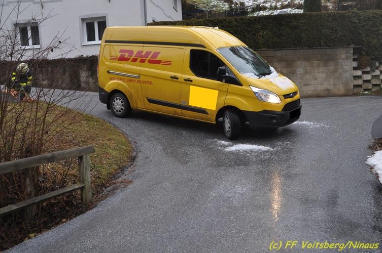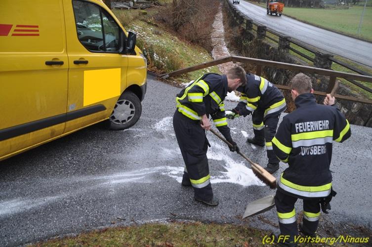 VOITSBERG, am 09.12.2017 Nach Auftreten von Blitzeis konnte ein Kleinbus auf einer Privatstraße nicht mehr weiterfahren. Sichern des Fahrzeuges mit einem Greifzug und Aufbringen von Streusalz. Es entstand kein Sachschaden.