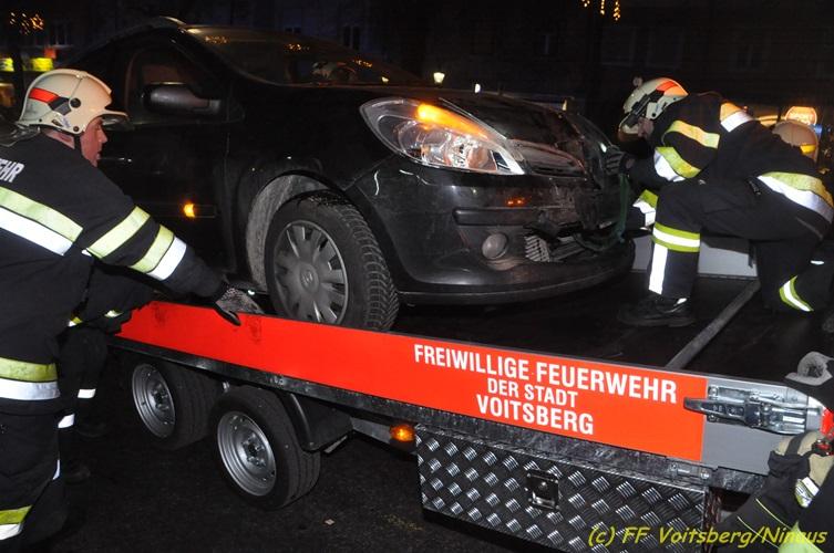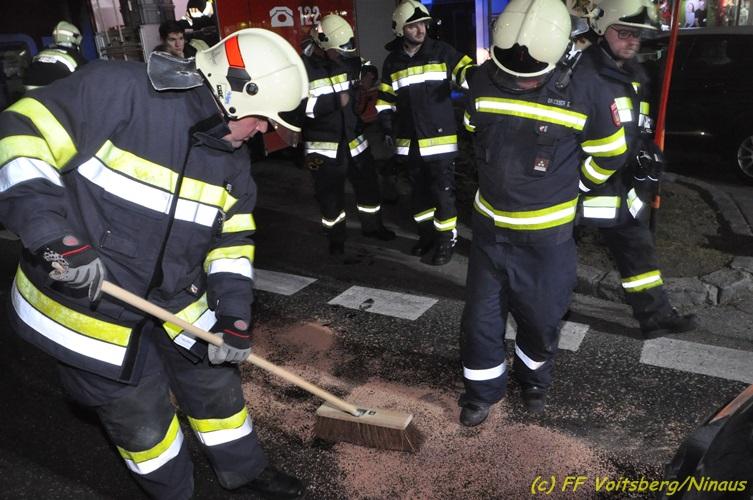 In den frühen Abendstunden des Mittwoch, 20. Dezember 2017 kam es am Voitsberger Hauptplatz zu einem Auffahrunfall. Ein in Richtung Graz fahrender Lenker fuhr mit seinem Fahrzeug auf ein vor ihm fahrendes Fahrzeug auf und verletzte die Lenkerin leicht. Bei einem Fahrzeug gelangten Betriebsmittel auf die Fahrbahn, welche von der FF Voitsberg gebunden wurden. Beide Fahrzeuge wurden von der Unfallstelle entfernt, wobei ein Fahrzeug aufgrund auslaufender Betriebsmittel von der Feuerwehr zu einem gesicherten Abstellplatz gebracht wurde. Aufgrund des Unfalls kam es zu einem Stau in beiden Richtungen. Die FF Voitsberg war mit 13 Einsatzkräften und drei Fahrzeugen unter dem Einsatzleiter Rene Sorger im Einsatz. Das Rote Kreuz versorgte die Verletzte und brachte sie in ein Krankenhaus. Die polizeilichen Erhebungen wurden von der PI Voitsberg durchgeführt. Text und Fotos: Walter Ninaus, FF Voitsberg