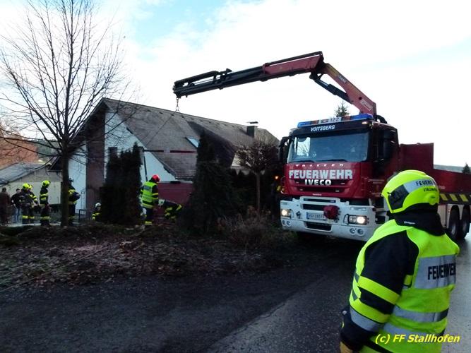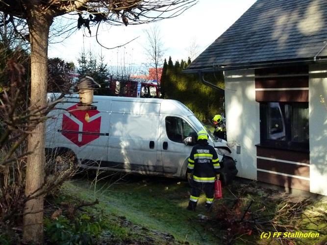 VOITSBERG, am 23.12.2017 In den Vormittagsstunden des Samstag, 23. Dezember 2017 kam ein Lenker eines Kleintransporters aus ungeklärter Ursache von der Landesstrasse zwischen Stallhofen und Bernau ab, durchstieß einen bepflanzten Zaun und prallte gegen eine Hausmauer. Bei diesem Unfall kann man von Glück sprechen, dass sich dort zum Unfallzeitpunkt niemand aufhielt. Der Lenker wurde von einem First Responder und Sanitätern der FF Stallhofen erstversorgt, mit Verletzungen unbestimmten Grades dem Roten Kreuz übergeben und ins LKH Voitsberg eingeliefert. Die Bergung des Fahrzeuges wurde in Zusammenarbeit der Feuerwehren Stallhofen (Seilwinde) und dem WLF-Kran Voitsberg durchgeführt. Eingesetzt waren insgesamt 34 Einsatzkräfte der Feuerwehren, des Rote Kreuzes und der Polizei. Nach 1,5 Stunden konnte der Einsatzleiter HBI Rupert Preglau das Ende des Einsatzes an Florian Steiermark melden.