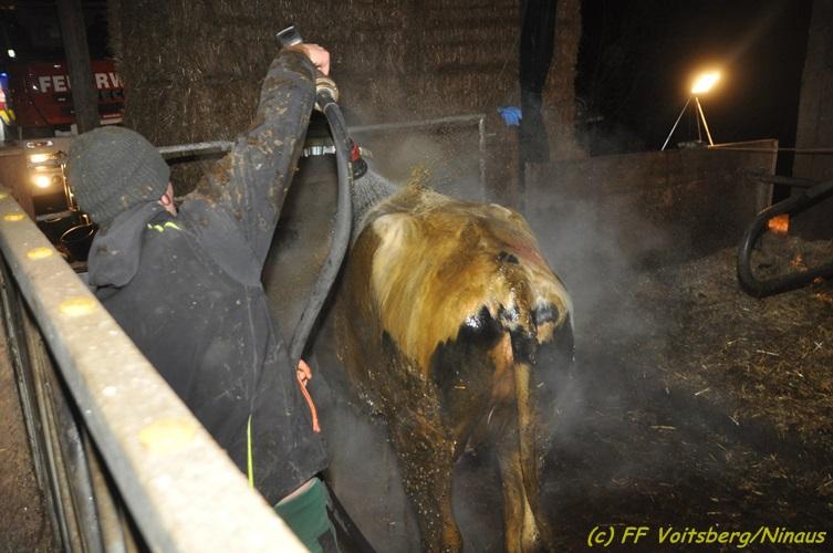 VOITSBERG, am 20.01.2018 In den frühen Abendstunden des Samstag, 20. Jänner 2018 stürzte auf einem bäuerlichen Anwesen im Ortsteil Lichtenegg der Stadtgemeinde Bärnbach eine Kuh in eine ca. 4 m tiefe, gefüllte Jauchengrube. Nach ersten erfolglosen Versuchen des Landwirtes und seines Sohnes das Tier zu retten wurde die FF Bärnbach über die LLZ Steiermark alarmiert. Nach dem Eintreffen begaben sich zwei Kameraden unter schwerem Atemschutz gesichert in die Grube, um die Einsatzlage zu erkunden. Man sicherte als Erstmaßnahme das Tier mit Leinen und Ketten. Des Weiteren wurde mit einem Drucklüfter frische Luft in die Grube geblasen. Zwecks Rettung der Kuh wurde unverzüglich das WLF der FF Voitsberg angefordert. Mit der Seilwinde des Krans wurde in Zusammenarbeit beider Wehren das unverletzte Tier mit Gurten geborgen. Nach der erfolgreichen Rettung wurde die Kuh gewaschen und auf ihren Stand im Stall gebracht.