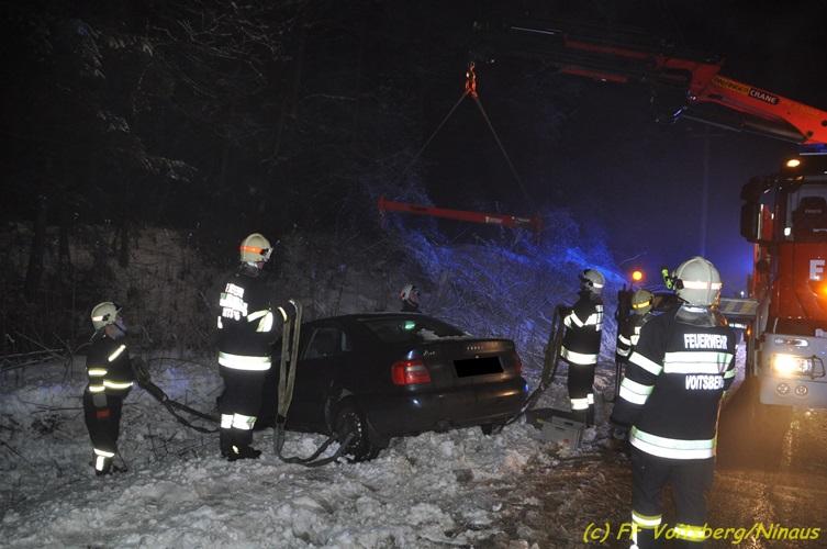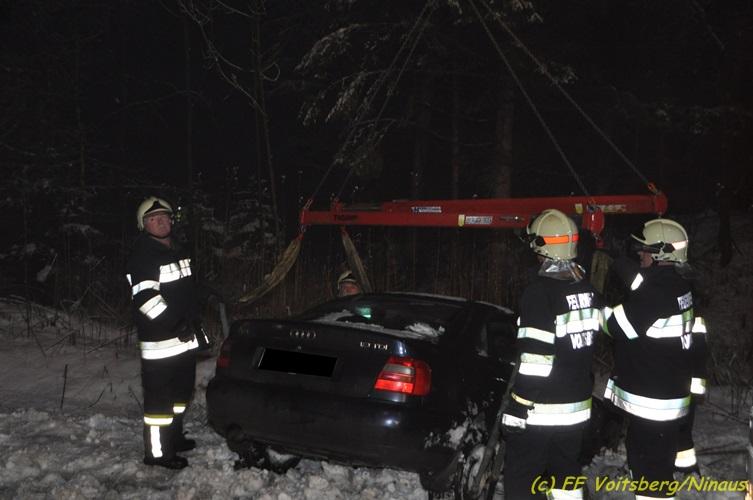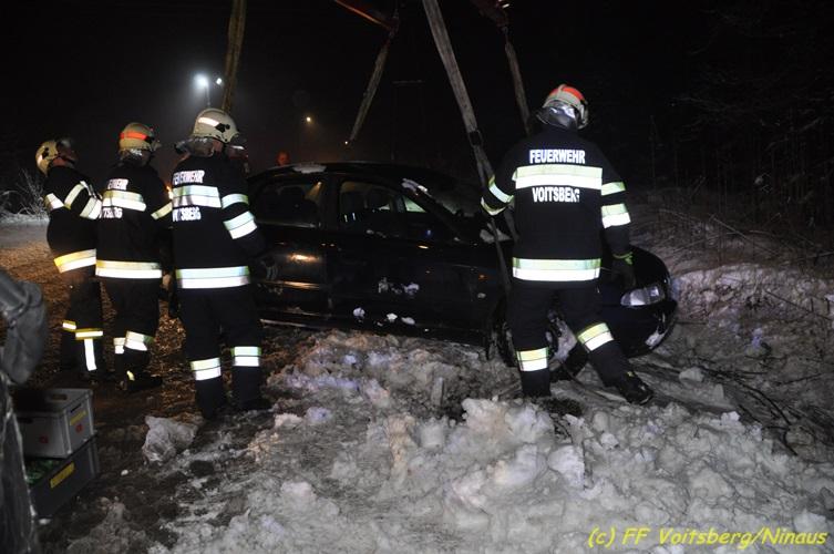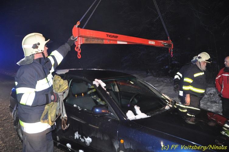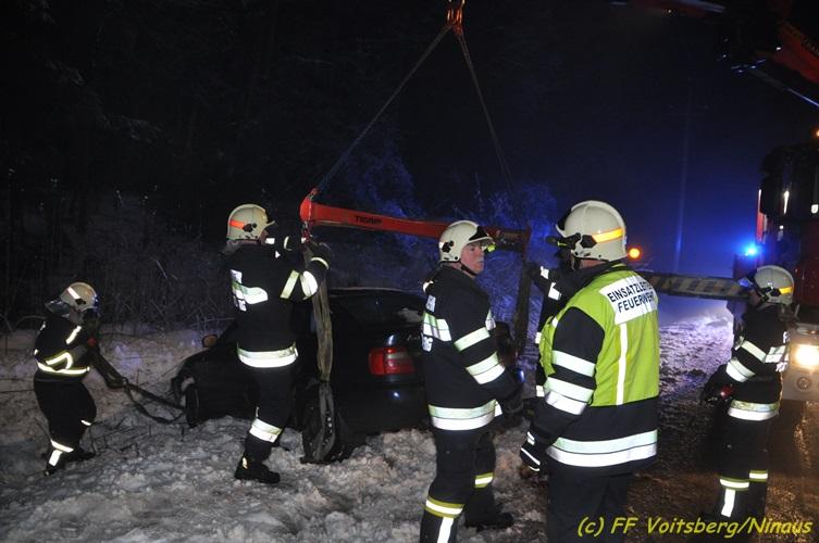 VOITSBERG, am 12.02.2018 Kurz nach 20 Uhr des Montag, 12. Februar 2018 kam ein Lenker mit seinem PKW in der Zangtalerstrasse in Voitsberg von der Straße ab und landete in einer Wiese neben der Straße im Tiefschnee. Er wurde mit dem WLF-Kran der FF Voitsberg geborgen und konnte die Fahrt auf eigener Achse fortsetzen. Verletzt wurde niemand.