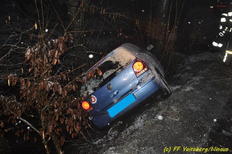 VOITSBERG, am 17.03.2018 In den frühen Abendstunden des Samstag, 17. März 2018 geriet eine Lenkerin aus unbekannten Gründen von der Gemeindestrasse im Freisinggraben (Gemeinde Bärnbach) von der Straße ab und stürzte seitlich ca. 2 m über einen Abhang gegen einen Baum, welcher einen weiteren Sturz in einen hochwasserführenden Bach verhinderte. Die Frau wurde im Fahrzeug eingeklemmt und musste von Kameraden der Feuerwehren Afling und Bärnbach aus ihrer misslichen Situation befreit werden. Sie wurde mit Verletzungen unbestimmten Grades in ein Krankenhaus eingeliefert. Die Bergung des Fahrzeuges wurde mit dem WLF-Kran der FF Voitsberg durchgeführt. Eingesetzt waren insgesamt 28 Kameraden der Feuerwehren Afling, Bärnbach und Voitsberg, das Rote Kreuz und die Polizei. Text und Fotos: Walter Ninaus, FF Voitsberg