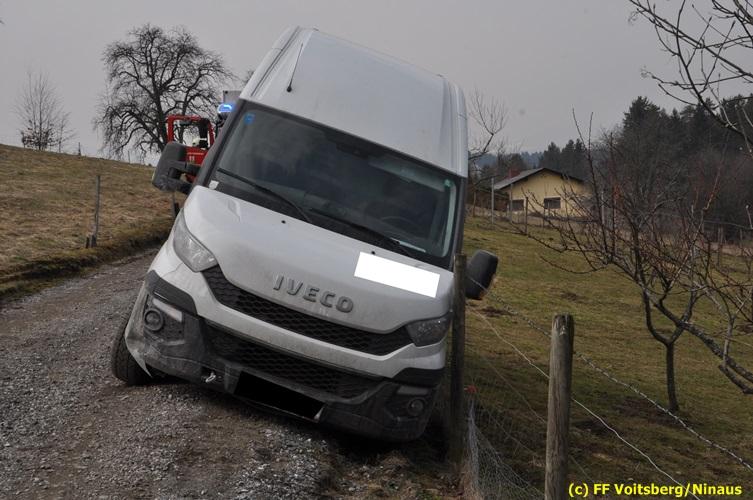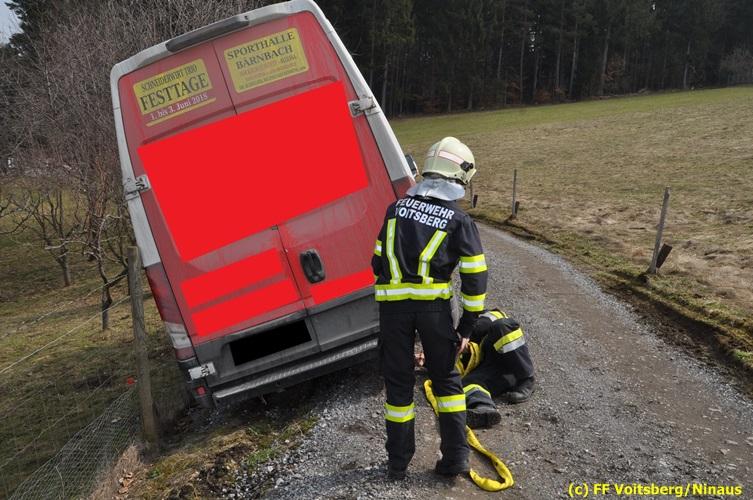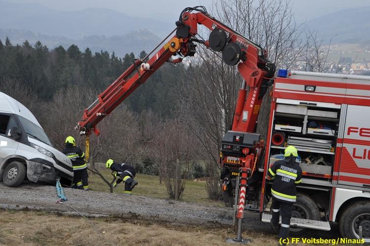 VOITSBERG, am 26.03.2018 Ein Lenker eines Kleintransporters kam beim Rückwärtsfahren links vom Weg ab. Die Bergung gestaltete sich schwierig, da das Fahrzeug jederzeit umzustürzen drohte. Mittels Sicherung durch Freilandanker und einer Umlenkrolle der FF Voitsberg sowie dem Kran des SRF Ligist konnte das Fahrzeug gemeinsam unbeschädigt auf die Straße gebracht werden und die Fahrt auf eigener Achse fortsetzen. Eingesetzt waren insgesamt 14 Kameradinnen der Feuerwehren Voitsberg und Ligist.