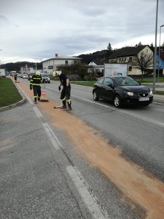 VOITSBERG, am 04.04.2018 In den Mittagsstunden des Mittwoch, 4. April 2018 platzte auf der Umleitungsstrecke für den Umfahrungstunnel vor dem Feuerwehrrüsthaus in der Grazer Vorstadt in Voitsberg einem ausländischen LKW ein Hydraulikschlauch. Die ausgelaufenen Betriebsmittel und die durch vorbeifahrende Fahrzeuge verursachte Ölspur wurden innerhalb kürzester Zeit gebunden. Durch einen Verkehrsregeldienst der Feuerwehr Voitsberg konnte auf der stark frequentierten Straße ein größerer Stau verhindert werden. 12 Mann / Frau standen unter der Einsatzleitung von ABI Gehr im Einsatz.