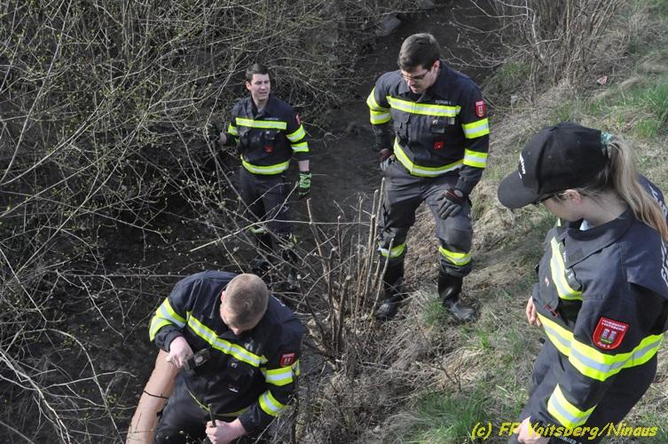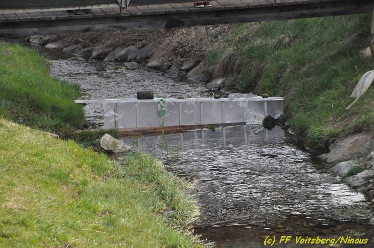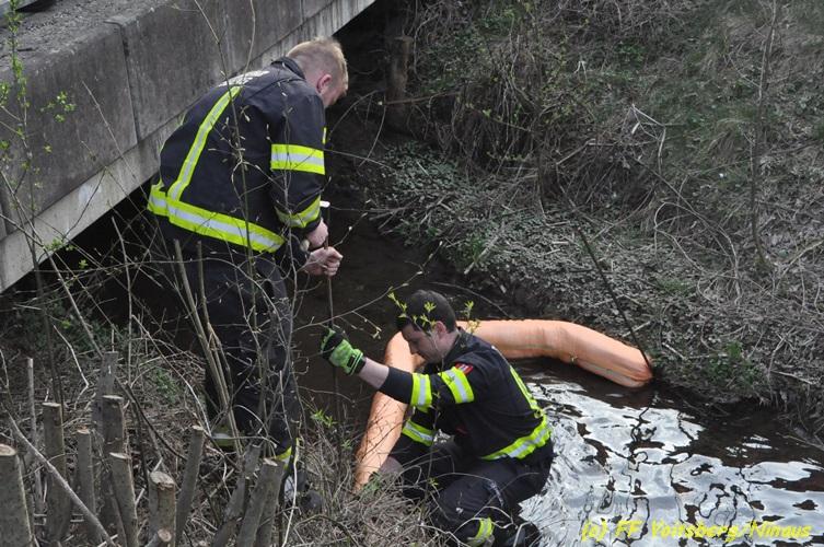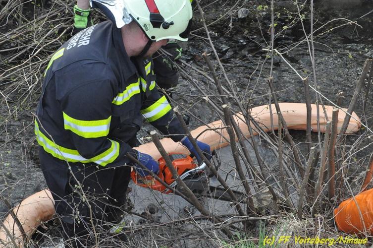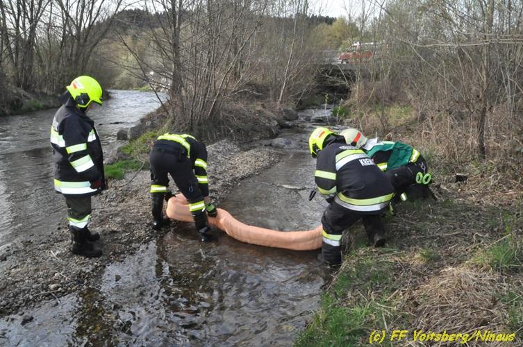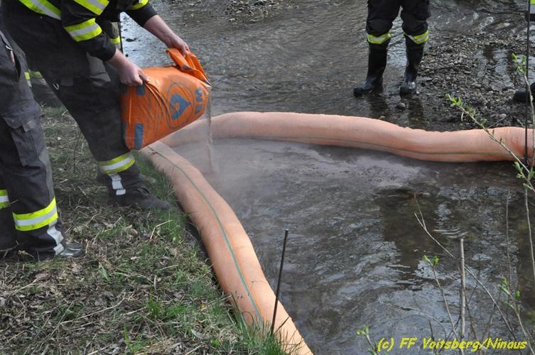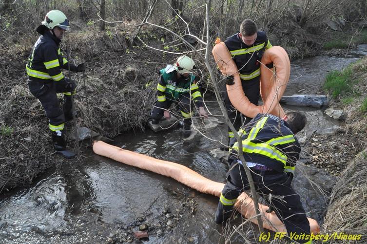 VOITSBERG, am 11.04.2018 Passanten bemerkten am Mittwoch, dem 11. April 2018 am Nachmittag einen Ölfilm am Lobmingbach im Ortsteil Krems der Stadtgemeinde Voitsberg im Bereich des ehemaligen Gasthauses Töscher und verständigten die Einsatzkräfte. Nach deren ersten Erkundung wurden sofort von den Feuerwehren Krems und Voitsberg insgesamt 12 Ölsperren auf einer Länge von 500 Meter am Lobmingbach errichtet, um eine Verschmutzung der Kainach zu verhindern. Ein Problem war die Suche nach der Ursache des Ereignisses. Es wurden letztendlich ein Zufluss zum Lobmingbach ausfindig gemacht, aus dem das Öl in den Lobmingbach gelangte. Nach weiterer, intensiver Suche durch die Feuerwehren und der Polizei konnte letztendlich ein altes, mit Schmierstoffen verunreinigtes Ölfass gefunden werden, welches als Wasserspeicher am Grundstück aufgestellt war und aus dem das verunreinigte Wasser über einen Kanal in den Bach gelangte. Seitens des ebenfalls verständigten Ölalarmdienstes des Landes Steiermark wurden Proben zwecks einer Laboruntersuchung entnommen.
