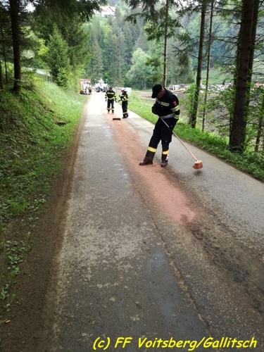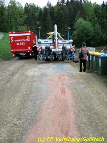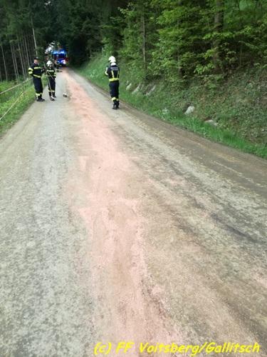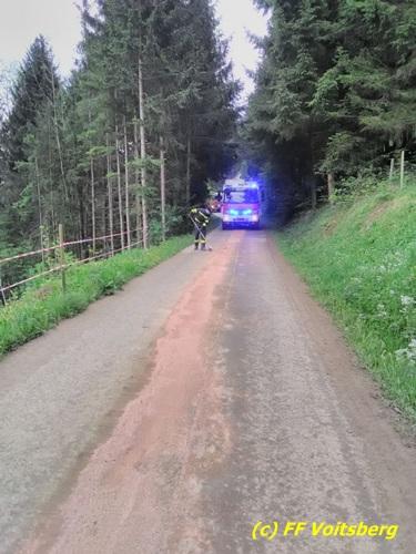 VOITSBERG, am 26.04.2018 Nach einem technischen Gebrechen an einem Traktor gelangten in den Vormittagsstunden des Mittwoch, 26. April 2018 Schmiermittel auf eine Gemeindestrasse und verschmutzten diese. Binden der ca. 100 Meter langen Ölspur mit Bindemittel und danach fachgerechte Entsorgung durch die FF Voitsberg. Eingesetzt waren unter OBI Bernd Unger 9 KameradInnen der FF Voitsberg. Fotos: Gallitsch/FF Voitsberg Text: Walter Ninaus/FF Voitsberg