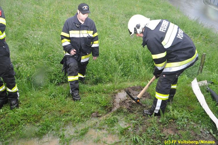 VOITSBERG, am 15.05.2018 Objekt von Wasser, welches über Wiese in Haus eintritt, mit Bau eines Sandsackdammes schützen und bereits eingetretenes Wasser mit Nasssauger absaugen.