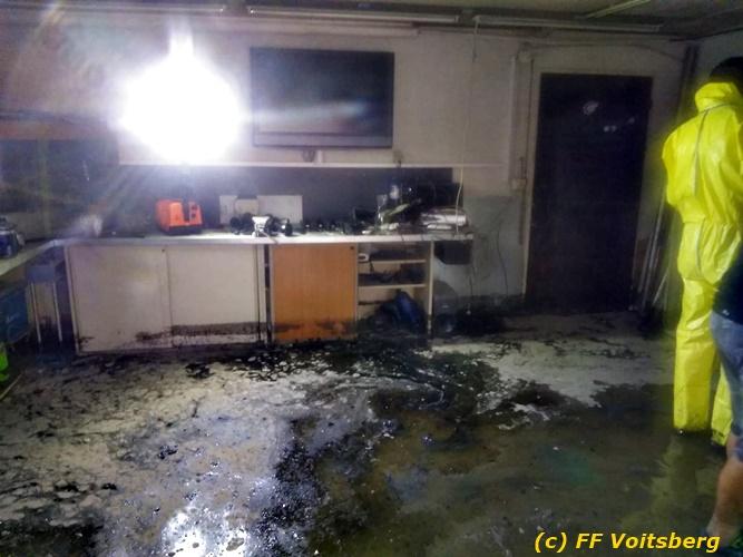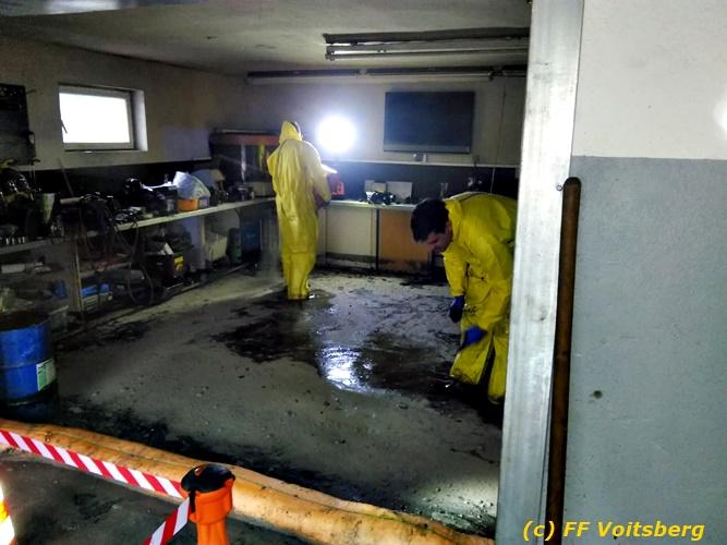 VOITSBERG, am 13.06.2018 Über Anforderung der FF Krottendorf wurde die FF Voitsberg als Gefahrenstützpunktwehr des Bereiches Voitsberg zwecks Hilfestellung bei einem Objekt in Krottendorf angefordert. Nach Erkundung der Lage wurde festgestellt, dass sich ein Ölfilm im Bereich der überfluteten Garage und des Kellers gebildet hat. Es wurde sofort eine Ölsperre errichtet und gleichzeitig Ölbindemittel aufgebracht. Hernach wurde das gebundene Bindemittel abgeschöpft und fachgerecht entsorgt. Der Chemiealarmdienst des Landes Steiermark wurde informiert. Text: Walter Ninaus/FF Voitsberg Fotos: FF Voitsberg