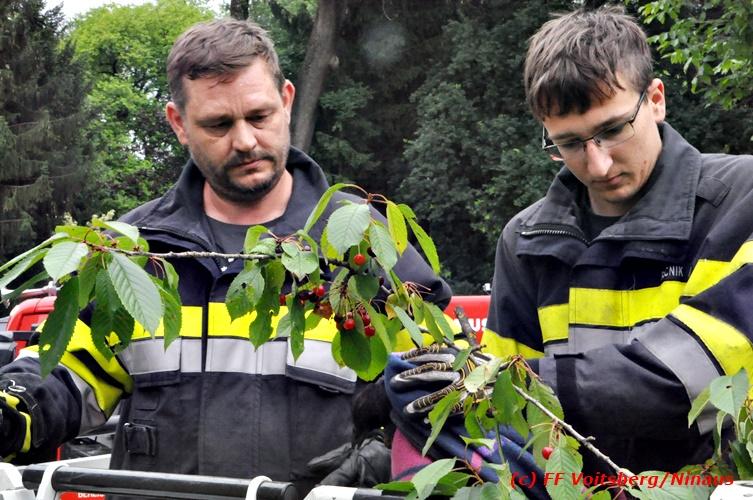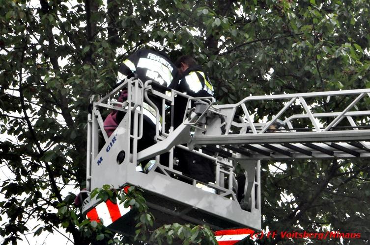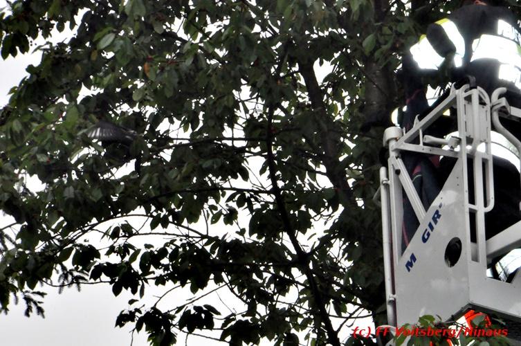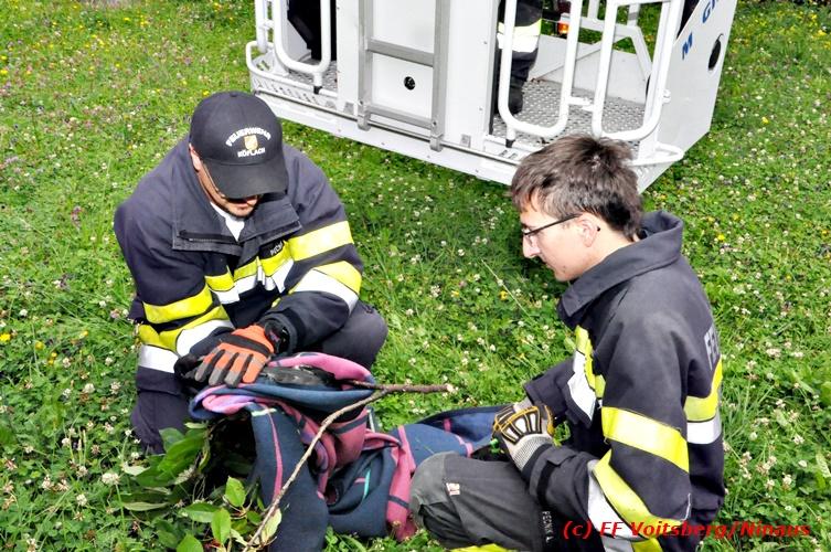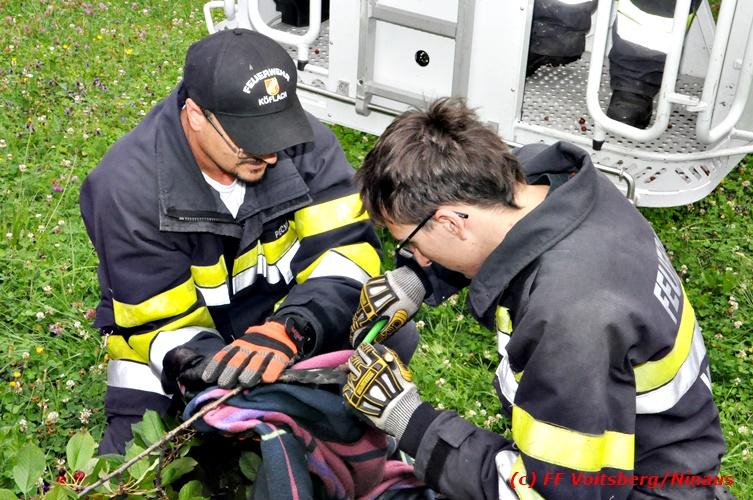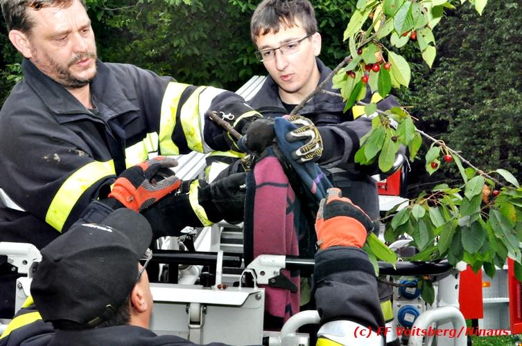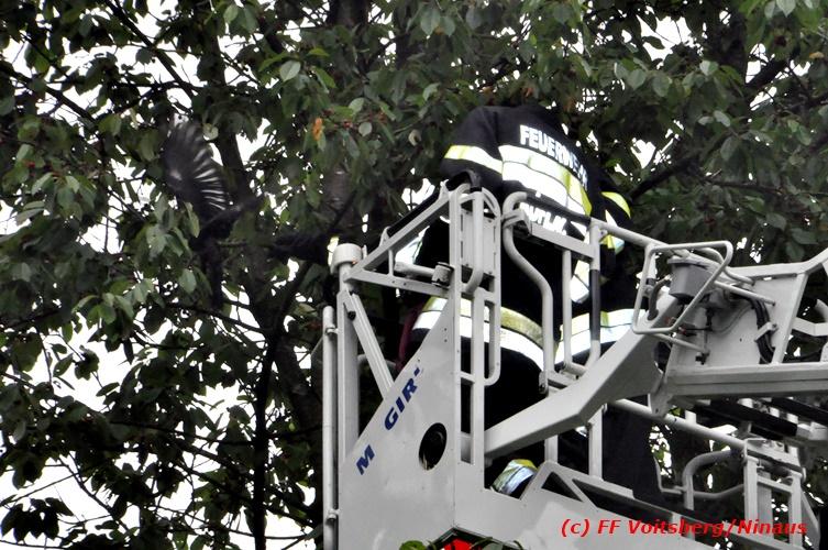VOITSBERG, am 28.06.2018 Anrainer bemerkten vor ca. 1 Woche einen Raben, welcher sich auf einem hohen Kirschbaum am Franz-Edler-Weg in Voitsberg aufhielt und nicht von der Stelle wich, wobei sie sich zuerst nichts dabei dachten. Nach einigen Tagen wurden sie durch das ständige Zu- und Abfliegen anderer Raben aufmerksam und konnten feststellen, dass diese den am Baum befindlichen Vogel mit Futter versorgten. Nach genaueren Recherchen konnten sie am Donnerstag, 28. Juni sehen, dass sich das Tier mit einer Fischerschnur an einem Ast verfangen hatte. Daraufhin verständigten die aufmerksamen Anrainer ABI Alfred Jauk der FF Voitsberg, welcher die Drehleiter Köflach zwecks Rettung des Tieres anforderte. Drei Kameraden der FF Köflach retteten schlussendlich das verängstigte, aber gestärkte Tier mit dem Ast auf den Boden. Dort wurde die Fischerschnur vom Ast und dem Raben entfernt und der Vogel konnte wieder unversehrt in die Freiheit entlassen werden. Dank gebührt neben der FF Köflach auch den aufmerksamen Nachbarn für ihre hilfreichen Beobachtungen und Handlungen auszusprechen. Text und Fotos: Walter Ninaus/FF Voitsberg