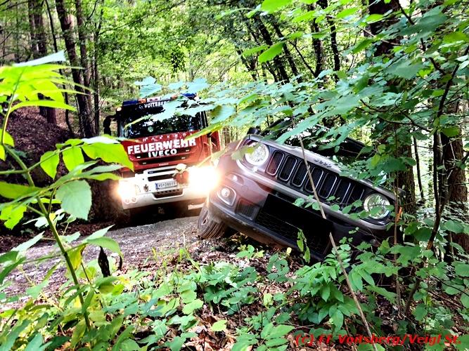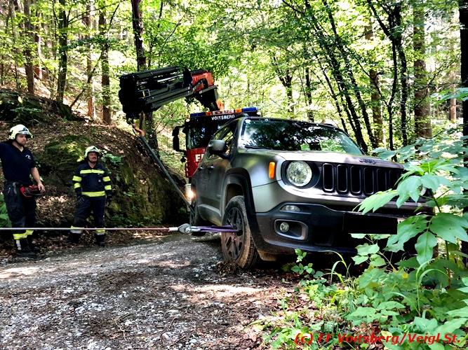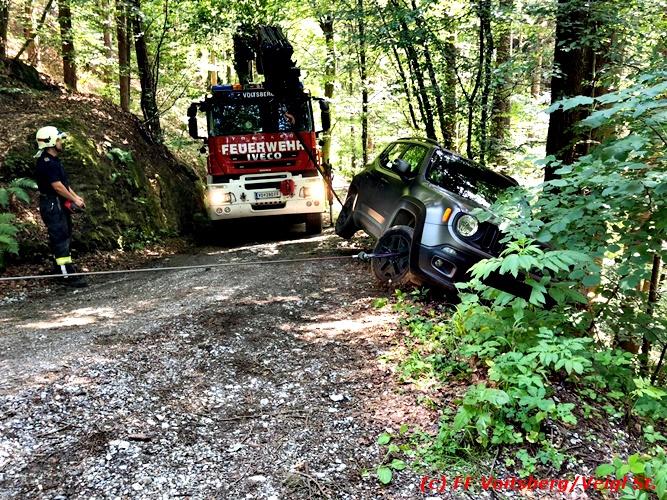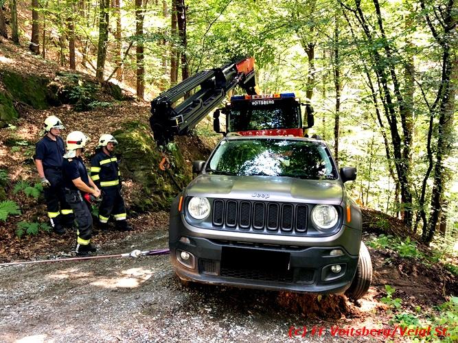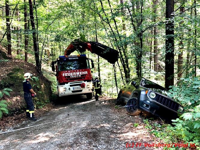 VOITSBERG, am 30.06.2018 Auf einer Gemeindestrasse in Bärnbach kam am 30.6.2018 in den Vormittagsstunden ein PKW von der Strasse ab, rutschte seitlich gegen einen Baum und blieb dort hängen. Die alarmierte FF Bärnbach sicherte das Fahrzeug und forderte zwecks Bergung das WLF-Kran der FF Voitsberg über die LLZ an. Mit vereinten Kräften, durch Sicherung des Fahrzeuges mit der Seilwinde des RLFA Bärnbach und dem Kran des WLF Voitsberg, wurde das Fahrzeug geborgen und der unverletzte Lenker konnte die Fahrt auf eigener Achse fortsetzen. Eingesetzt unter der Einsatzleitung von HBM Wolfgang Schönner (FF Bärnbach) waren 11 KameradInnen der Feuerwehren Bärnbach und Voitsberg. Text: Walter Ninaus/FF Voitsberg Fotos: Stefan Veigl/FF Voitsberg