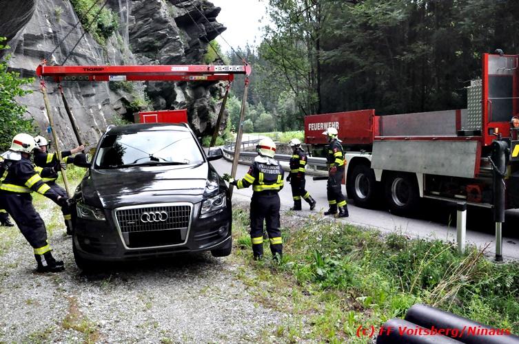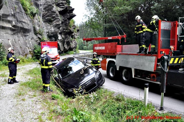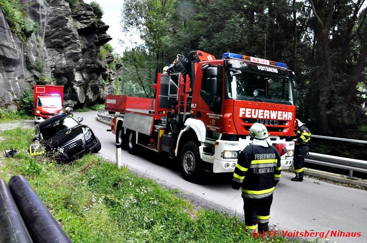 VOITSBERG, am 11.07.2018 Kurz nach Mittag am Mittwoch, dem 11. Juli 2018 geriet eine Lenkerin mit ihrem PKW rechts von der Strasse ab und rutschte in einen Straßengraben. Da Gefahr eines Ölaustrittes bestand, wurde die FF St. Martin a. W. alarmiert. Zwecks Bergung wurde das WLF-Kran der FF Voitsberg nachalarmiert. Unterdessen sicherte die FF St. Martin die Unfallstelle ab und regelte den Verkehr. Das Fahrzeug wurde unbeschädigt geborgen und setzte Fahrt auf eigener Achse fort. Schmiermittel sind keine ausgetreten und auch keine weiteren Schäden konnten festgestellt werden. Die Feuerwehren St. Martin a. W. und Voitsberg waren insgesamt mit 11 Einsatzkräften im Einsatz. Text und Fotos: Walter Ninaus/FF Voitsberg