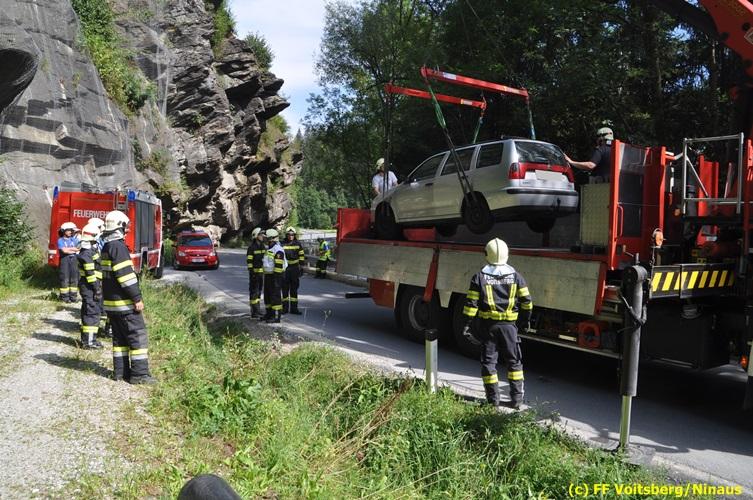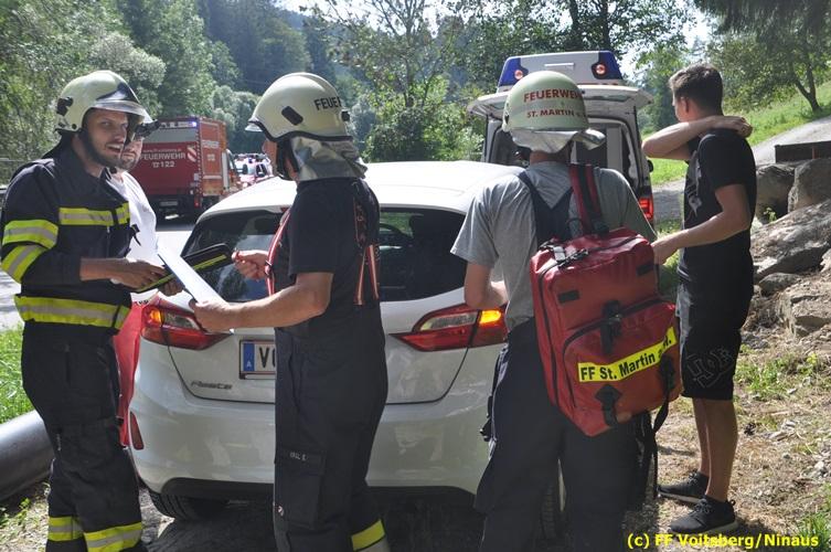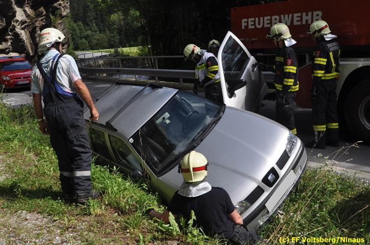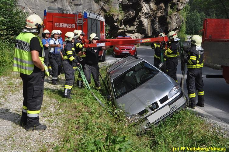 VOITSBERG, am 27.07.2018 Aus ungeklärter Ursache geriet am Freitag, 27. Juli 2018 um ca. 15 Uhr eine PKW-Lenkerin mit ihrem Fahrzeug in der Gößnitzstrasse von der Straße ab und landete im Straßengraben. Ein nachfahrender PKW-Lenker befreite die betagte Frau aus dem Fahrzeug und verständigte das Rote Kreuz und die Feuerwehr über Notruf. Die zuständige Feuerwehr St. Martin a. W. sicherte die Unfallstelle ab und versorgte die unbestimmten Grades verletzte Person bis zum Eintreffen des Roten Kreuzes, welche die Verletzte ins LKH Voitsberg einlieferte. Zwecks Bergung des Fahrzeuges wurde das WLF-Kran der FF Voitsberg angefordert. Eingesetzt waren unter der Einsatzleitung von HBI Konrad Klug (FF St. Martin a. W.) insgesamt 18 Einsatzkräfte der Feuerwehren St. Martin a. W. und Voitsberg, die Polizei Voitsberg mit 2 Beamten und das Rote Kreuz mit 2 Sanitätern. Während der Rettungs- und Bergungsarbeiten wurde die Gößnitzstrasse gesperrt. Text und Fotos: Walter Ninaus/FF Voitsberg