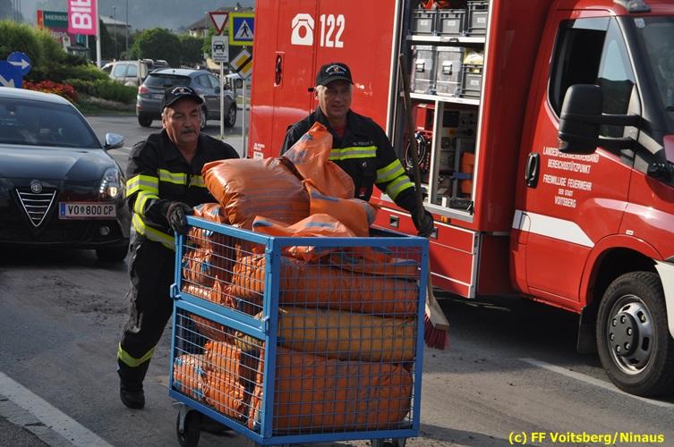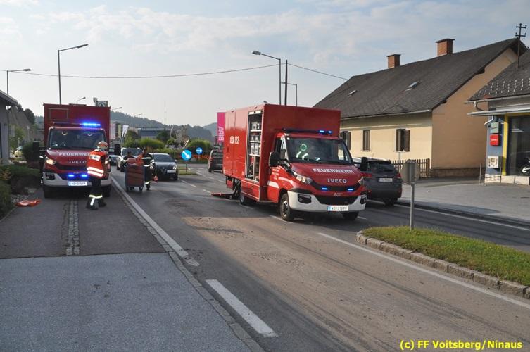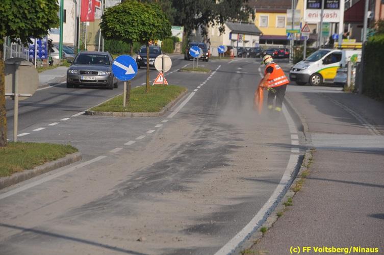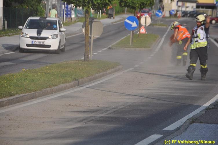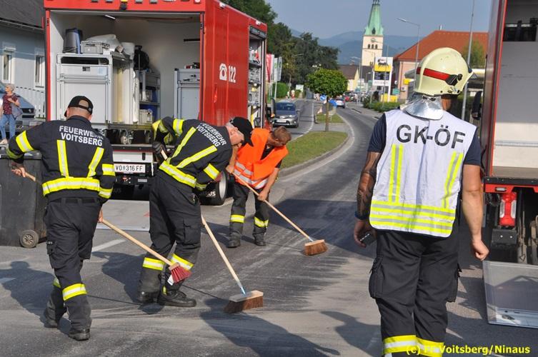 VOITSBERG, am 03.08.2018 Nach einem technischen Gebrechen bei einem LKW verlor dieser Hydrauliköl und verunreinigte die Fahrbahn im Bereich des Kreisverkehrs in der Grazer Vorstadt in Voitsberg auf einer Gesamtlänge von ca. 600 m. Die alarmierte FF Voitsberg band das ausgelaufene Öl, saugte das verunreinigte Bindemittel mit einer feuerwehreigenen Kehrmaschine auf und entsorgte dies fachgerecht. Während des Einsatzes wurde der Verkehr kurz angehalten, was im Frühverkehr auf der Umleitungsstrecke der gesperrten Umfahrung Voitsberg zu ausgedehnten Staus in Richtung Köflach führte. Eingesetzt waren 9 Einsatzkräfte der FF Voitsberg, 2 Kräfte des Bauhofes Voitsberg und 2 Kräfte der Straßenmeisterei Voitsberg. Text und Fotos: Walter Ninaus/FF Voitsberg