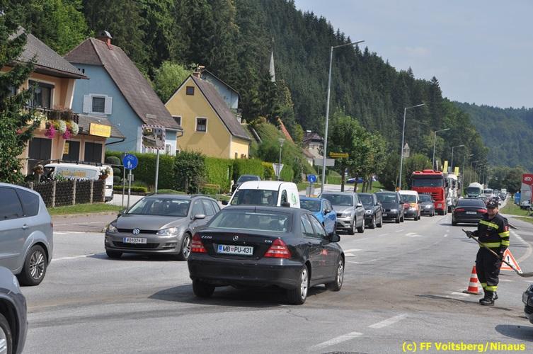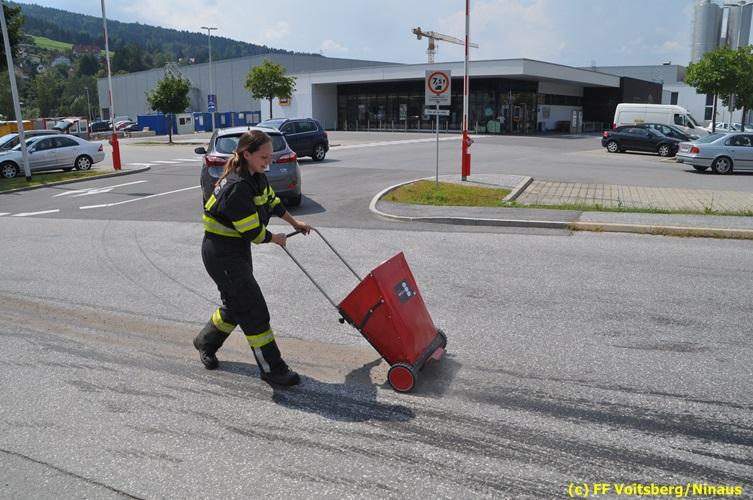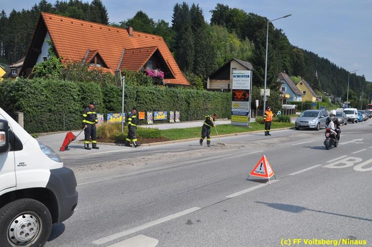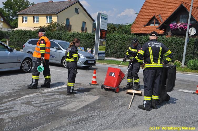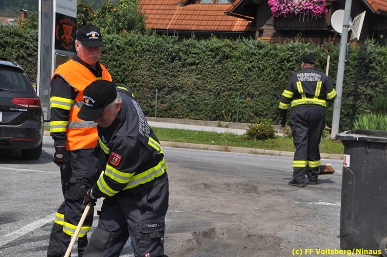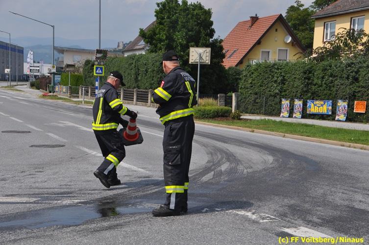 VOITSBERG, am 06.08.2018 Nach einem Platzer eines Ölschlauches bei einem PKW kam es am Montag, 6. August 2018 um ca. 13:30 Uhr in der Grazer Vorstadt in Voitsberg zu einer Verschmutzung der Fahrbahn durch das ausgelaufene Öl. Die alarmierte FF Voitsberg sicherte die Einsatzstelle ab und band mittels Bindemittel die ausgeflossenen Betriebsmittel. Das verunreinigte Ölbindemittel wurde mittels feuerwehreigener Kehrmaschine aufgesaugt und fachmännisch entsorgt. Während des Einsatzes wurde die Umleitungsstraße der B 70 kurzfristig gesperrt, wobei es zu einem Rückstau in beiden Richtungen kam. Eingesetzt waren 8 Einsatzkräfte unter der Einsatzleitung von BR Ing. Klaus Gehr sowie zwecks Aufstellen von Warntafeln ein Bediensteter des Bauhofes Voitsberg. Text und Fotos: Walter Ninaus/FF Voitsberg