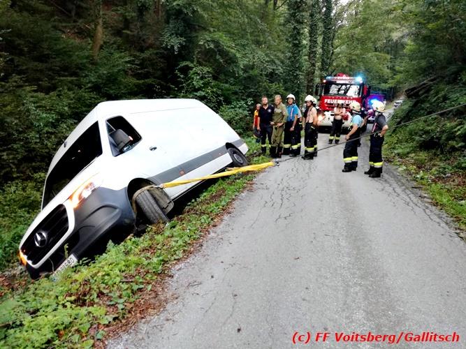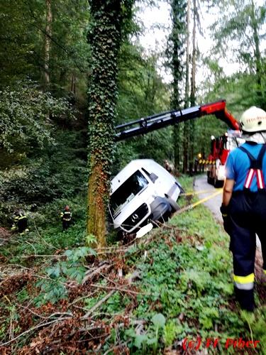 VOITSBERG, am 09.08.2018 Aus ungeklärter Ursache kam am Donnerstag, 09.08.2018 ein Lenker eines Klein-Transporters in Piberegg auf der Rösslerwirt-Straße von der Straße ab und drohte abzustürzen. Der Lenker konnte sich selbst aus dem Fahrzeug befreien und verständigte die Polizeiinspektion Köflach. Die zuständige Feuerwehr Piber sicherte den Klein-Transporter mittels Seilwinde und richtete eine Umleitung für den Verkehr ein, da die schmale Straße während der Bergungsarbeiten gesperrt werden musste. Zur Bergung des Fahrzeuges wurde über die LLZ das WLF-Kran der FF Voitsberg nachalarmiert. Gemeinsam mit dem WLF-Kran und der Seilwinde der FF Piber konnte das Fahrzeug erfolgreich geborgen werden. Eingesetzt waren unter der Einsatzleitung von OBR Christian Leitgeb insgesamt 19 Einsatzkräfte der Feuerwehren Piber und Voitsberg sowie die Polizei Köflach mit 2 Beamten. Nach der erfolgreichen Bergung konnte der Fahrer die Fahrt fortsetzen. Text: FF Piber/Leitgeb Fotos: FF Piber, FF Voitsberg/Gallitsch